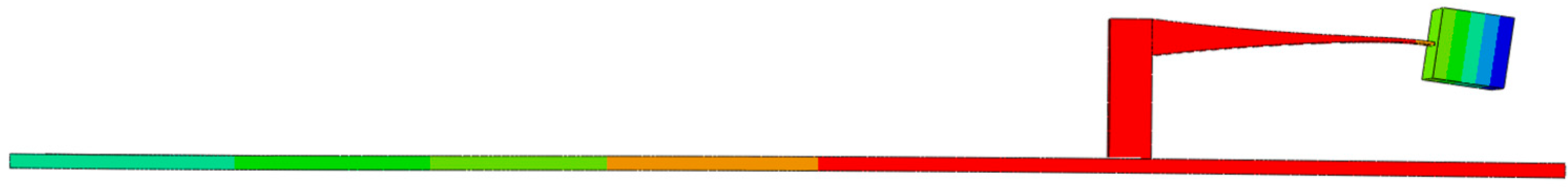 For the concrete model setup, the host structure was modeled using 7075 aluminums with dimensions of 1.1 m × 0.1 m × 0.01 m. Considering the material’s width-to-thickness ratio of 10:1 and length-to-thickness ratio of 110:1, the influence of thin-shell theory on results cannot be ignored. Beam elements in Abaqus neglect the effect of width on calculations, leading to significant discrepancies between the simulation results and the actual values. Therefore, a solid element with dimensions of 1.1 m × 0.1 m × 0.01 m is used for simulation in the finite element model. Material properties conform to 7075Al’s national standard density (2820 ), Young’s modulus (71 ), and Poisson’s ratio (0.33). The model was meshed using second-order tetrahedral elements. Boundary conditions specified a fixed constraint on the left end surface of the host structure.