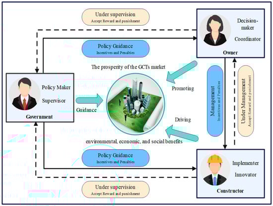 The owners act as the decision-makers and coordinators for GCTs’ application, selecting suitable scenarios under policy guidance and engaging constructors through market mechanisms to implement GCTs. The constructors, as the executor and innovator, are subject to government regulation and the owners’ management, responsible for applying these technologies in projects and participating in innovation. The government, owners, and constructors play distinct yet interconnected roles, mutually influencing and reinforcing each other to advance GCTs’ development and application, thereby achieving environmental, economic, and social benefits [18,24,25]. Their interrelationships are shown in Figure 1.
