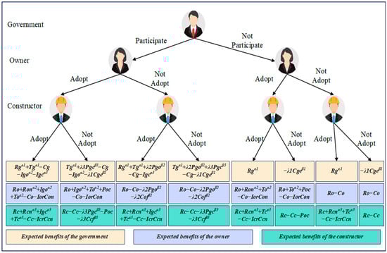 Based on the model assumptions, parameter settings, and subjective valuations, the expected benefits for the government, owners, and constructors under different strategy combinations are calculated, as shown in Figure 2.