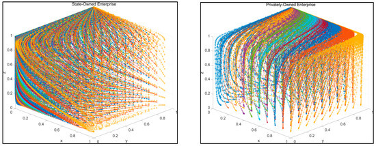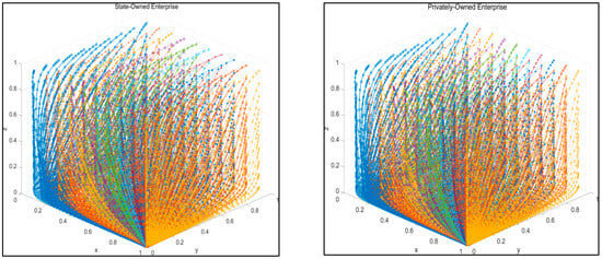 The future-development parameters Cof and Ccf directly capture how changes in market share affect enterprise growth and strategic choice. Market share is driven by external factors such as technology maturity, competitive pressure, and consumer demand; thus, varying Cof and Ccf for both SOE and private enterprises allows us to indirectly assess the influence of these external drivers on strategy selection, as illustrated in Figure 9.