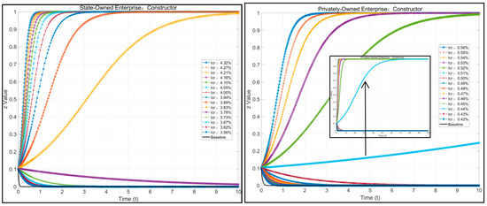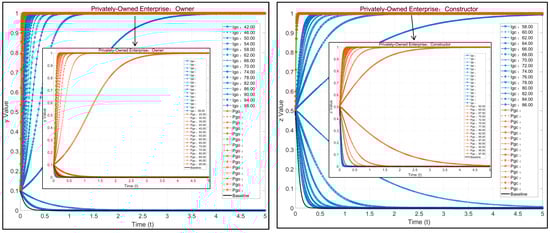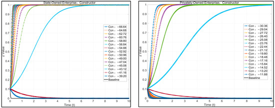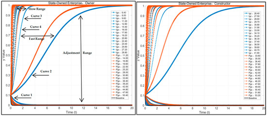 Table 5 further reveals that, within the fast convergence range, the sensitivity ranking for SOE owners is Igo > Pgo > Con > Cof, while for constructors it is Ccn > Igc > Pgc > Ccf. For private enterprises, the owner ranking is Cof > Con > Igo > Pgo, and the constructor ranking is Ccf > Igc > Ccn > Pgc. When the system moves from the fast to the slow range, sensitivities drop sharply (e.g., Igo falls from 14.556 to 1.763 and 0.919), yet the sensitivity order remains intact. These rankings provide an intuitive guide to the relative influence of each parameter on strategy choice, enabling the government to set policy priorities rationally.