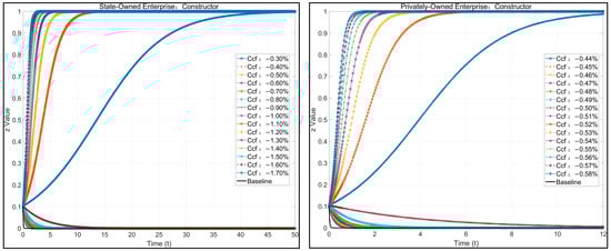 Cost is the single most critical parameter in the “adopt” versus “not adopt” decision; holding all other variables constant, we simulated the separate impact of Ccn variations on SOE and private-enterprise constructors, as shown in Figure 10.
