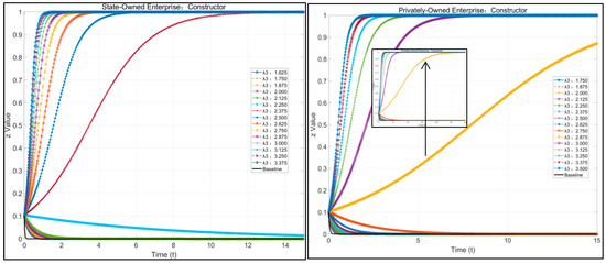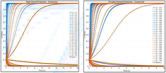 Figure 12 simulates the constructor strategy evolution under a step size of 0.125 for λ3 for both SOE and private enterprises. When λ3 rises to 2.375 for SOE constructors and 2.875 for private constructors, the constructor switches rapidly from “not adopt” to “adopt”, passing through the strategy adjustment range, the fast convergence range, and the slow convergence range. Higher λ3 values accelerate the shift. The corresponding thresholds for owners are 1.875 for SOEs and 2.125 for private enterprises. The results indicate that SOEs always sit in the lower loss-aversion interval, showin markedly higher tolerance for potential losses than private enterprises.