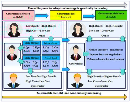 In the government-led market phase, the government strengthens incentive policies, implements penalty measures, and cultivates industry talents. According to the eigenvalues 2 and 3 of E8(1, 1, 1), when the benefits for owners and constructors exceed the additional costs, they will choose the “Adopt” strategy, which is IorCon λ2Pgoβ2 + λ2Cofβ2 + Igoα2 + Ronα2 + Toα2 and IcrCcn Igcα3 + λ3Ccfβ3 + λ3Pgcβ3 + Poc + Rcnα3 + Tcα3. In this case, E8(1, 1, 1) is the equilibrium point.