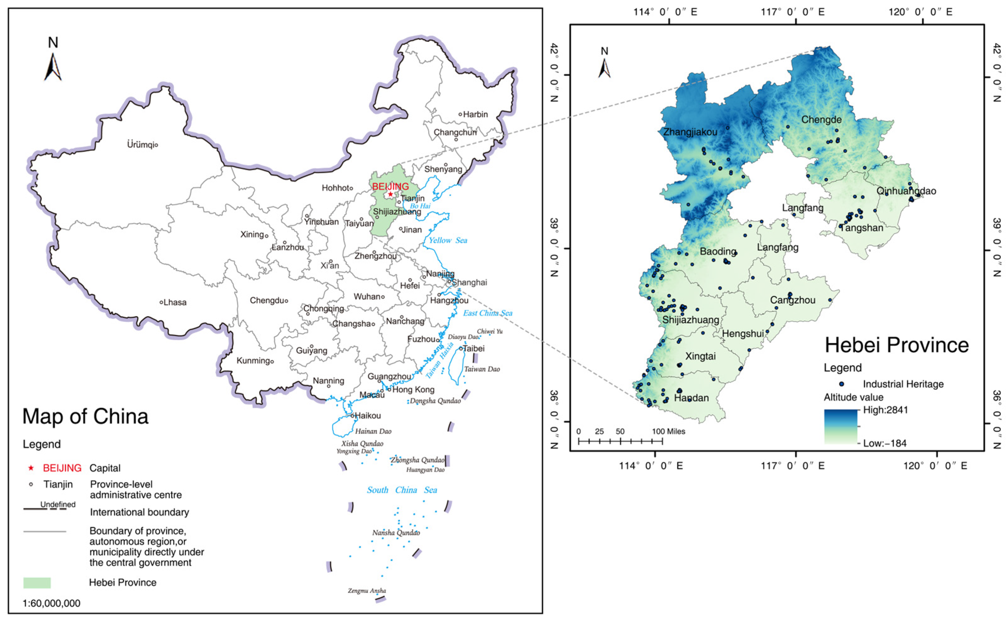 Figure 11a). Notably, although the western mountainous areas of Shijiazhuang and Handan, along the eastern foothills of the Taihang Mountains, contain a large number of industrial heritage sites, their regression coefficients are among the lowest. This phenomenon is not primarily caused by topographical conditions but rather by historical policy factors. During several key historical periods such as the War of Resistance Against Japanese Aggression, the War of Liberation, and the early years of the People’s Republic of China under the First Five-Year Plan and the Third Front Construction, a large number of military-industrial projects were established in mountainous and peripheral regions, forming clusters of red industrial heritage. To enhance concealment, many factories were located in valley areas at relatively low elevations, resulting in a strong negative correlation between elevation and the spatial distribution of industrial heritage in these regions.