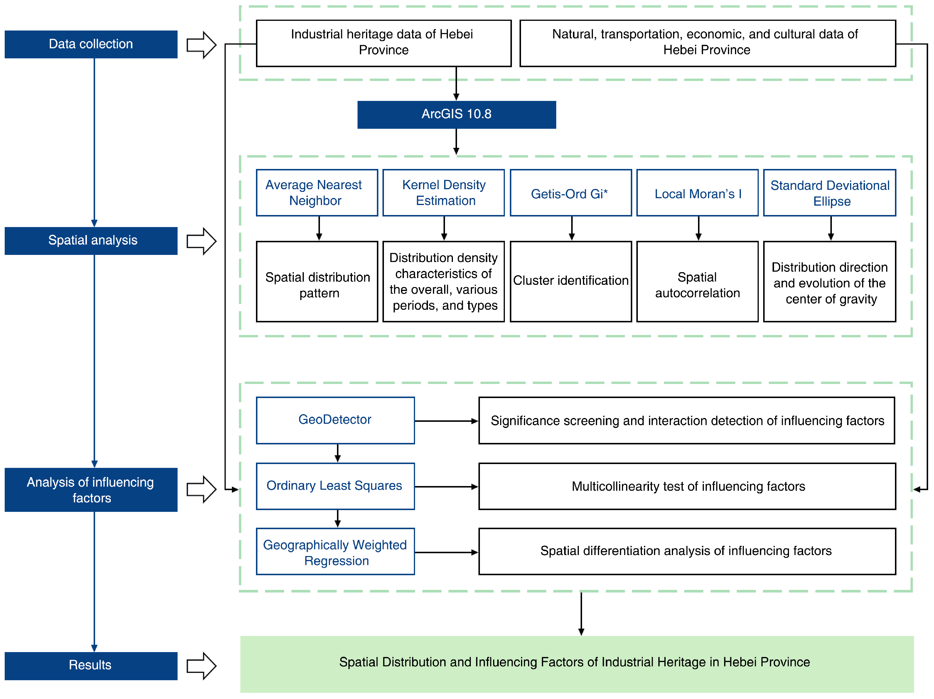 Methodologically, the GeoDetector was first applied to quantify the overall explanatory power of each influencing factor on the spatial distribution of industrial heritage, to identify statistically significant factors, and to analyze the interaction types among them. On this basis, both the OLS and GWR models were constructed to examine the spatial non-stationarity and local variations in the explanatory power of each factor, thereby providing a more comprehensive understanding of the complex influences shaping the spatial distribution of industrial heritage in Hebei Province.