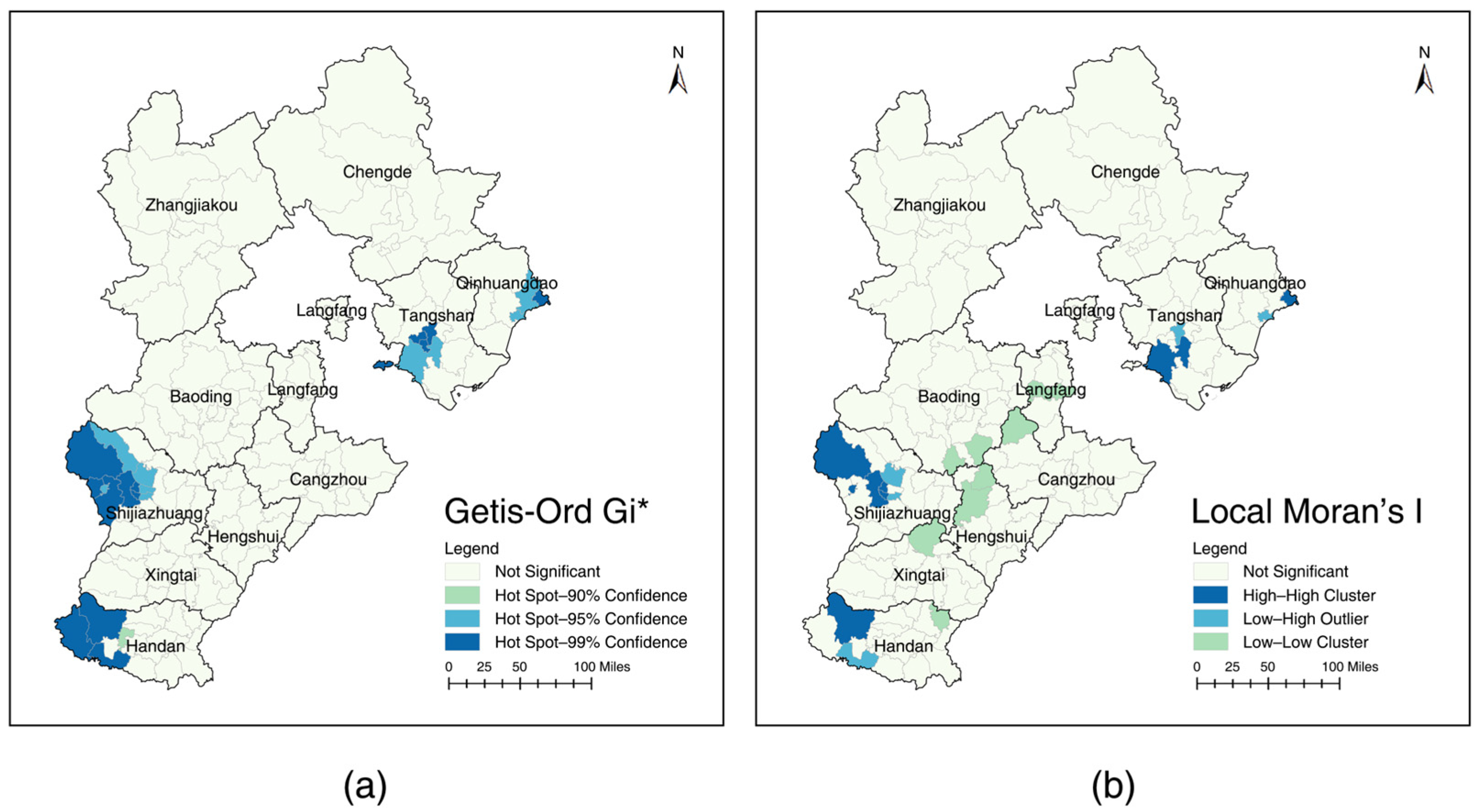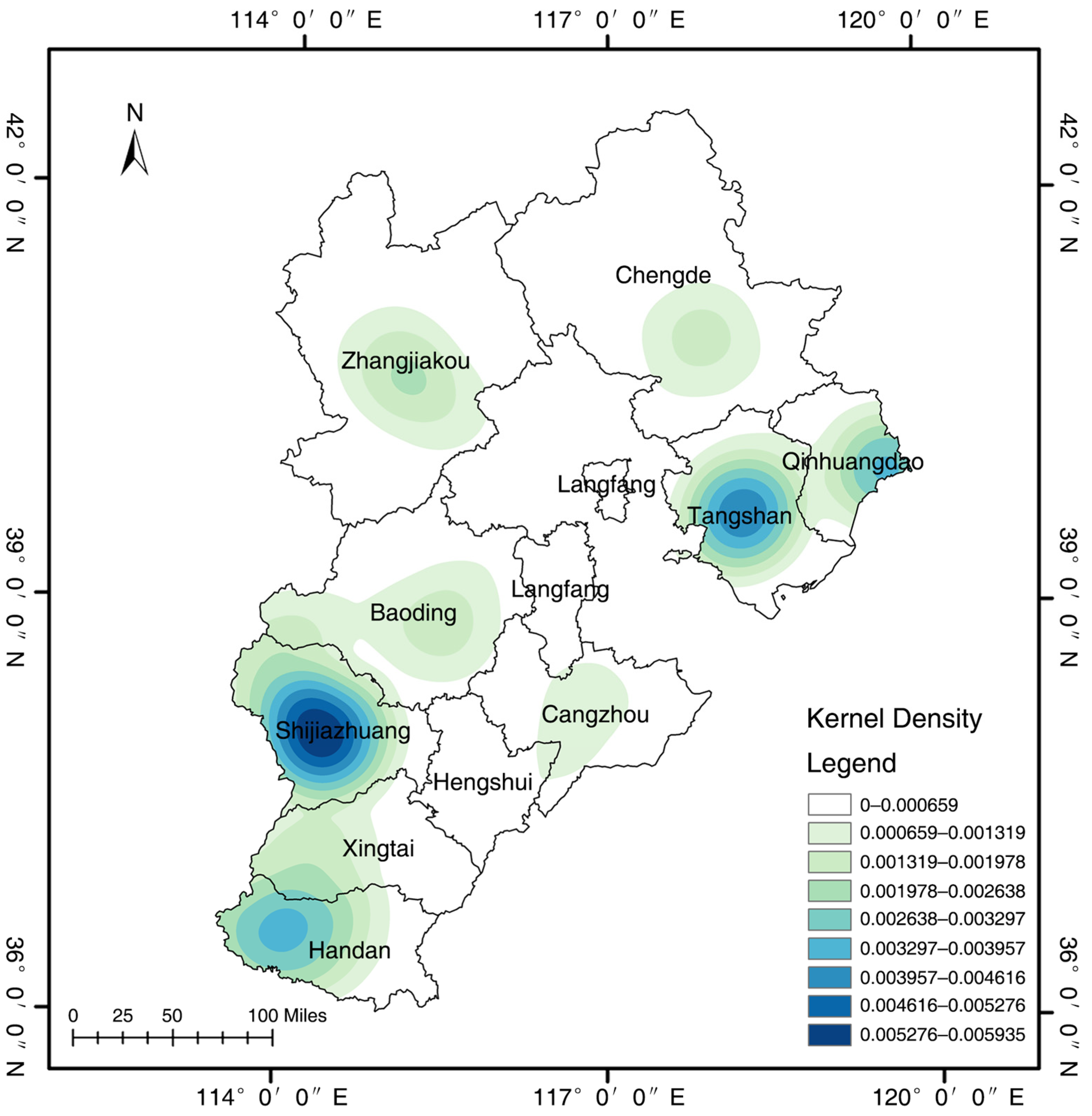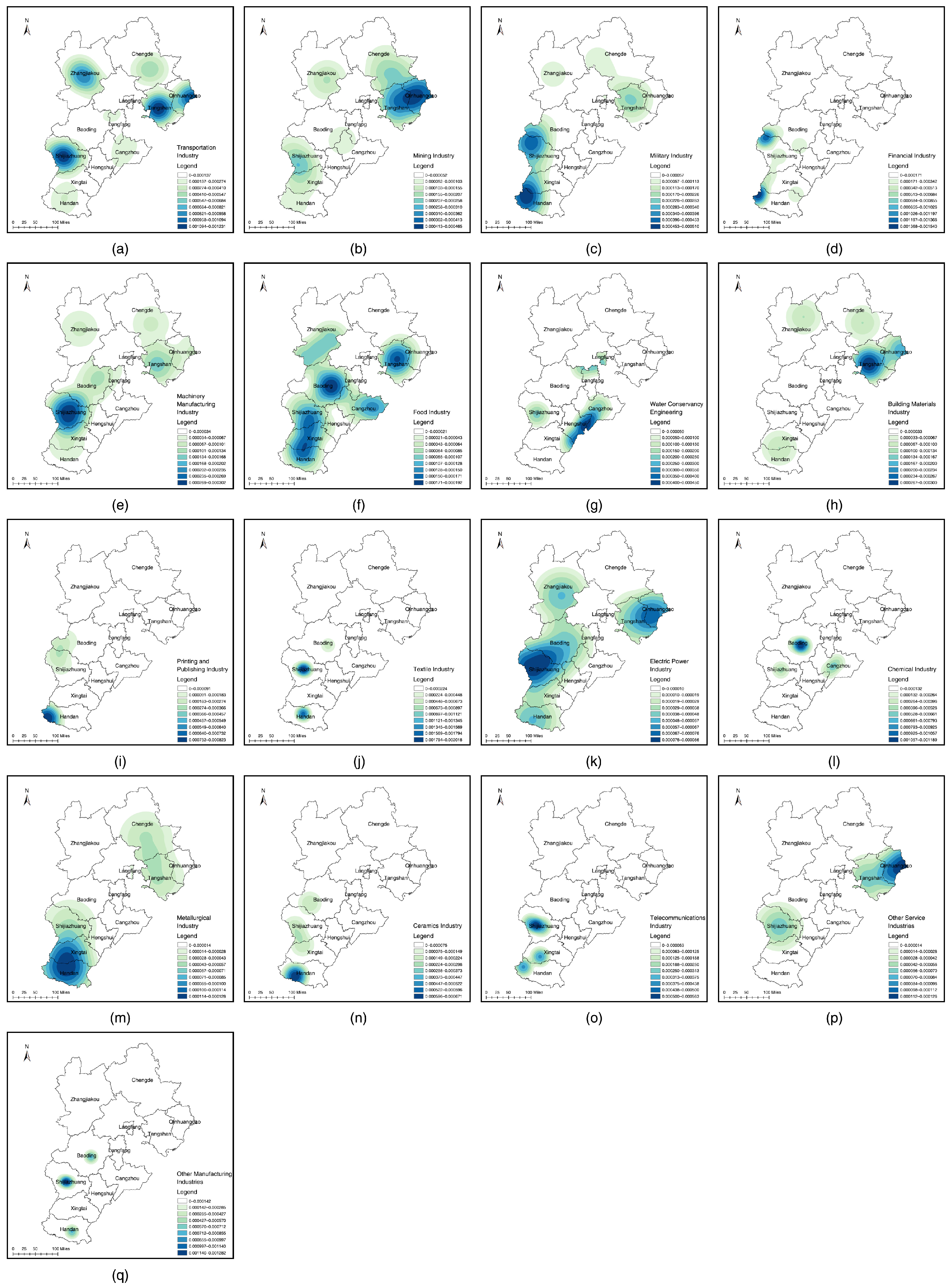 58]. As a result, road networks are primarily oriented toward rural–urban connectivity and tourism travel, and their spatial pattern does not show a stable correspondence with the formation of industrial heritage. In coastal cities such as Tangshan and Qinhuangdao, early industrial development relied mainly on railways and ports, so the road network did not play a determining role in shaping the distribution of industrial heritage. With ongoing industrial restructuring, the function of road networks has increasingly shifted from supporting traditional industries to serving coastal tourism and port-related logistics, further weakening their statistical association with the spatial pattern of industrial heritage.