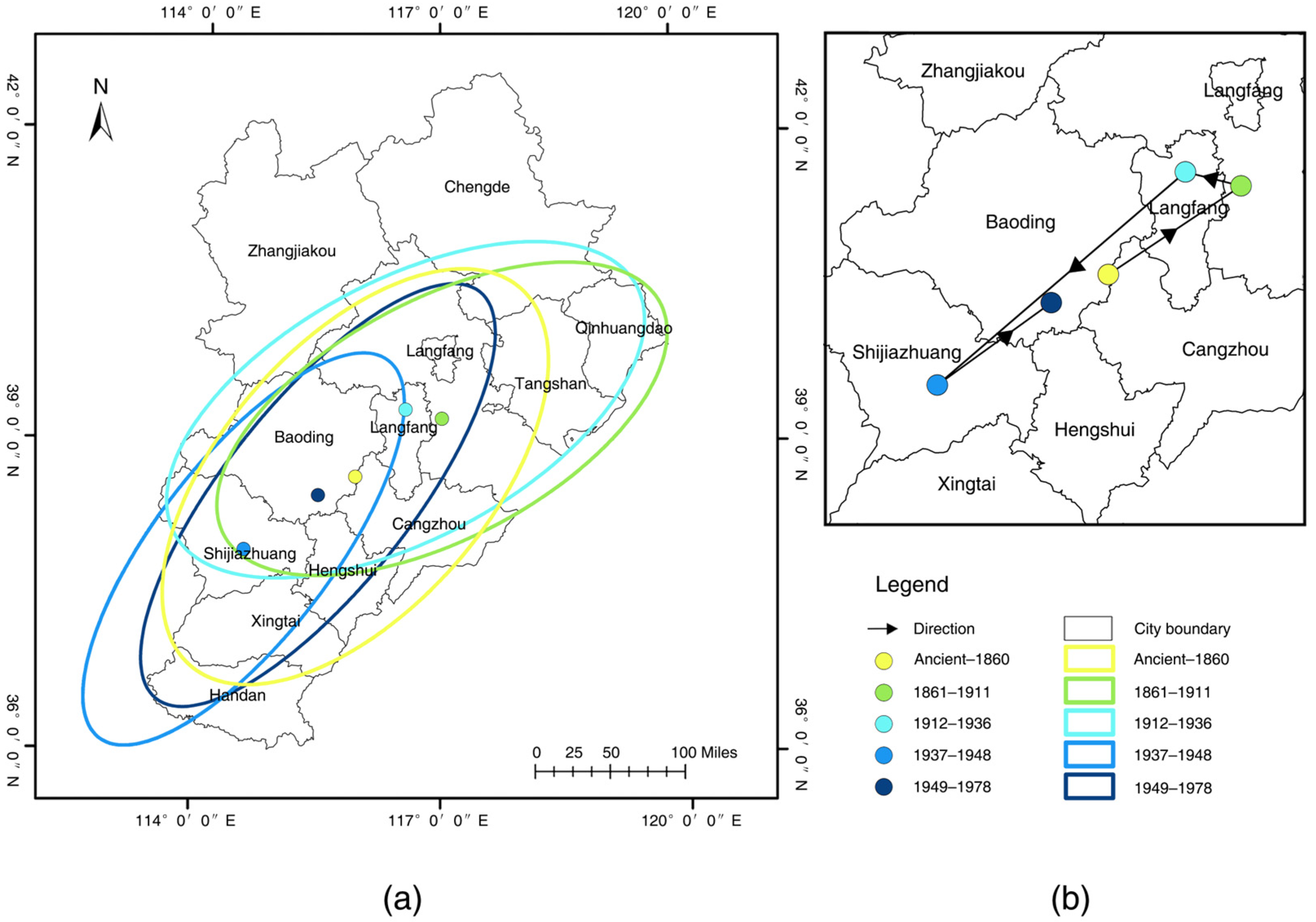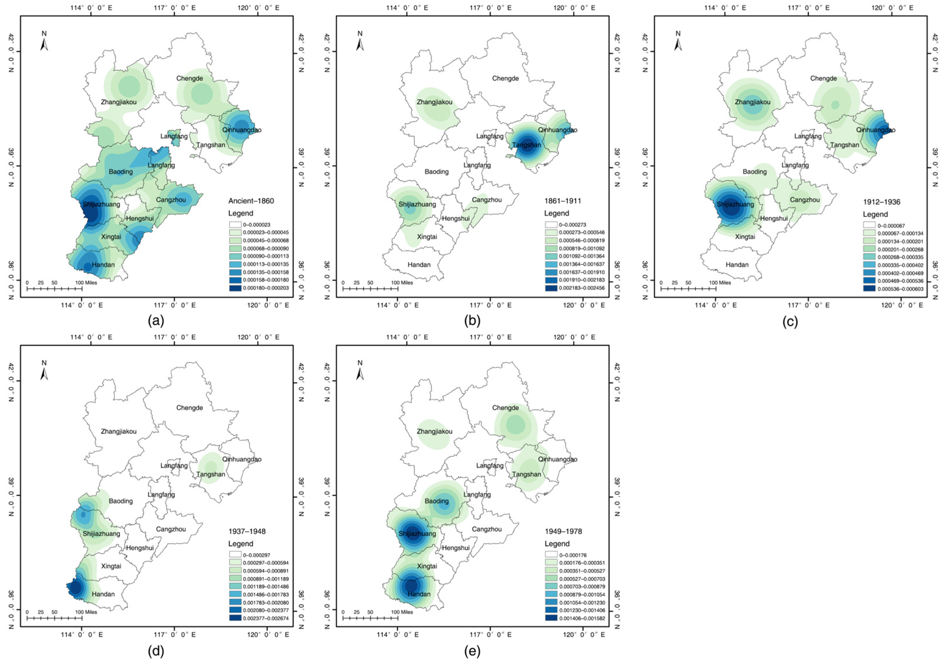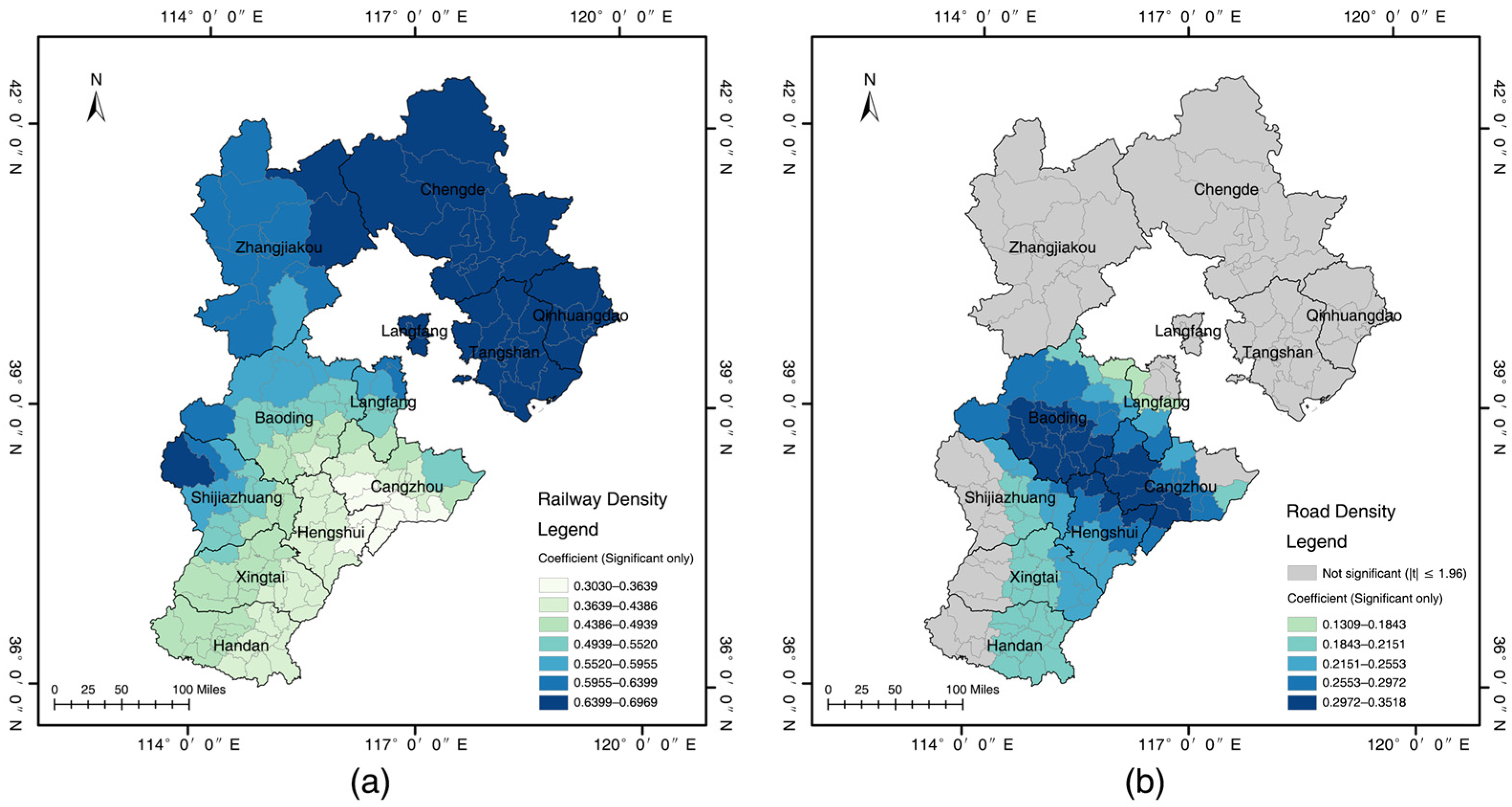 Figure 10a). The northern and eastern regions of Hebei show notably higher coefficients, suggesting that railways play a particularly strong role in promoting industrial heritage clustering in these areas. These regions represent the birthplace of modern railways and industrialization in China, where railway construction directly stimulated the development of mining, metallurgy, and port-related industries, ultimately shaping a railway-oriented pattern of industrial heritage distribution [