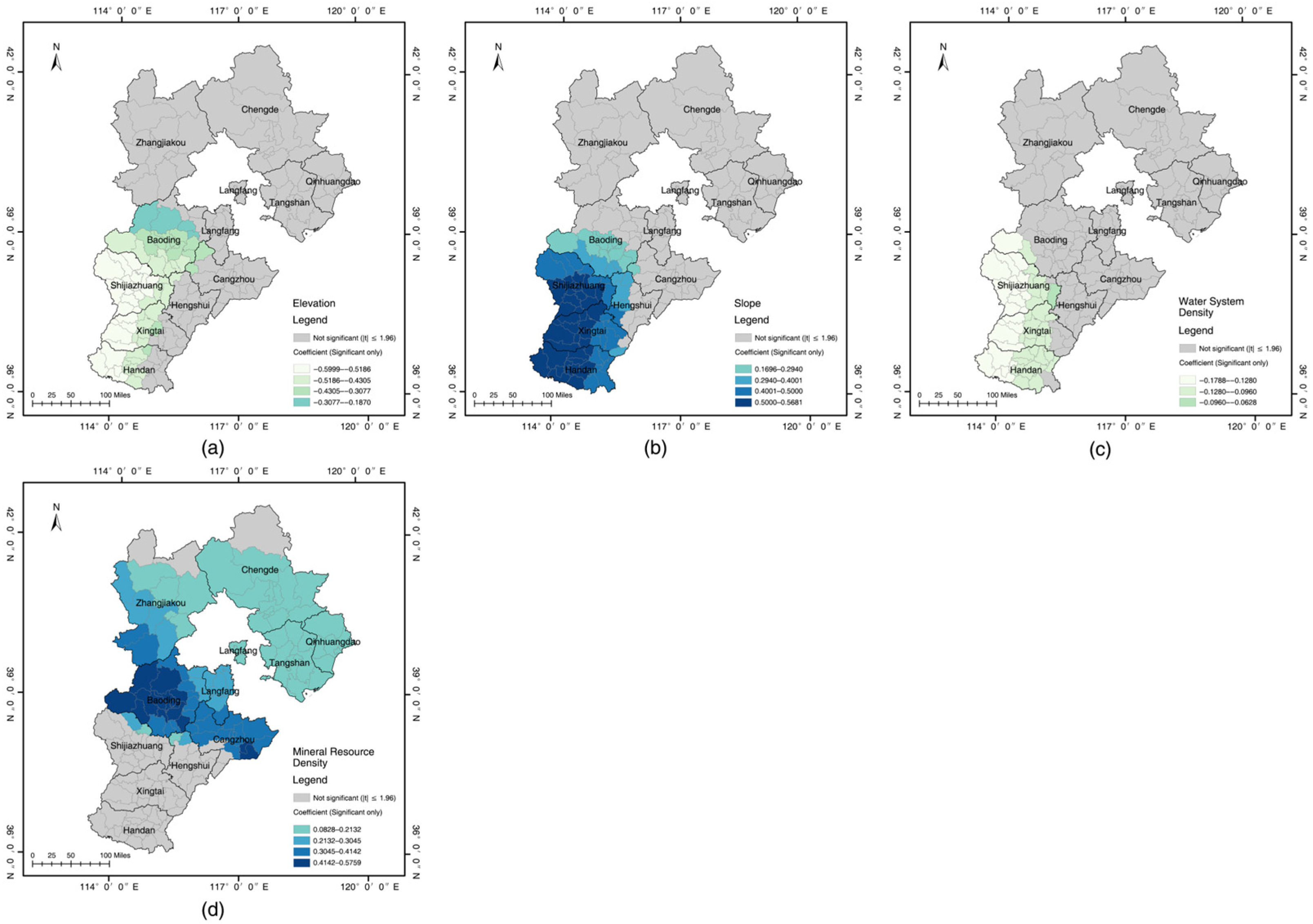 Slope represents terrain variability and is a key geographic factor affecting the feasibility and cost of industrial construction. The GWR results indicate that the significant influence of slope is spatially concentrated in the southwestern Taihang Mountains, similar to the pattern observed for elevation (