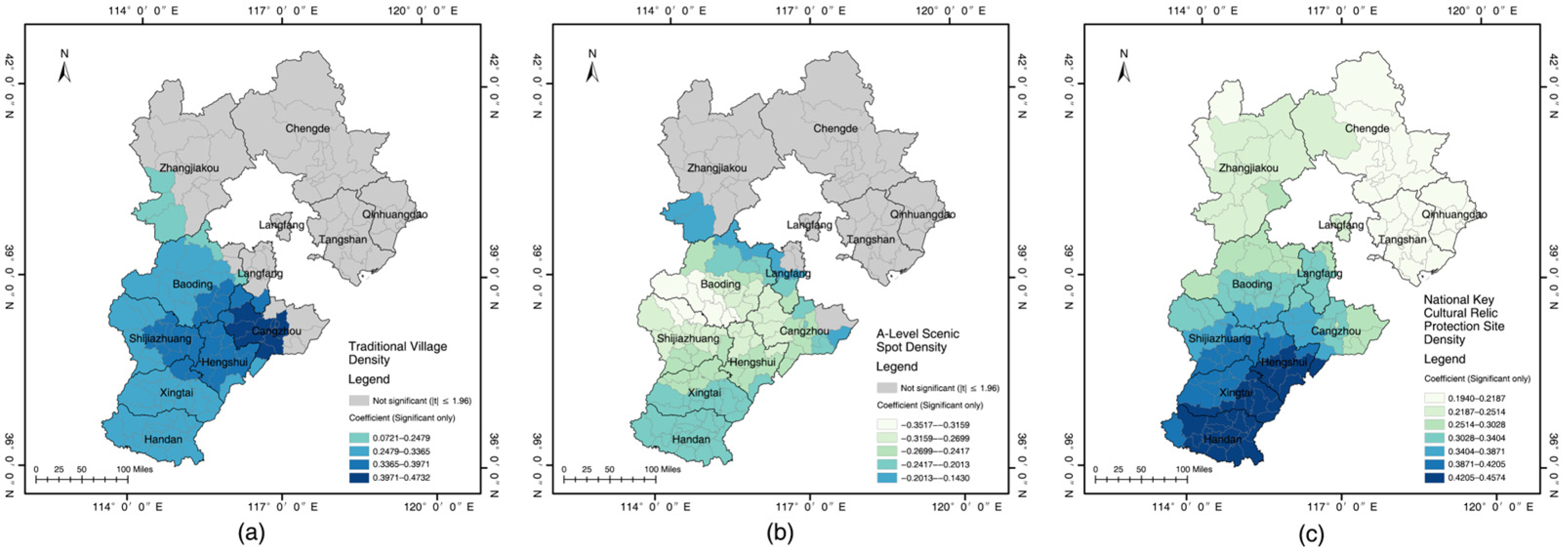Figure 12c). Higher coefficients appear in southern Hebei, particularly in Hengshui, Xingtai, and Handan, where historical sites and industrial heritage coexist and traditional and industrial cultures reinforce each other. Coefficients are lower in the north, suggesting weaker spatial associations. Overall, the influence of this factor decreases from south to north, indicating that industrial heritage and traditional culture are more closely intertwined in the southern part of the province.