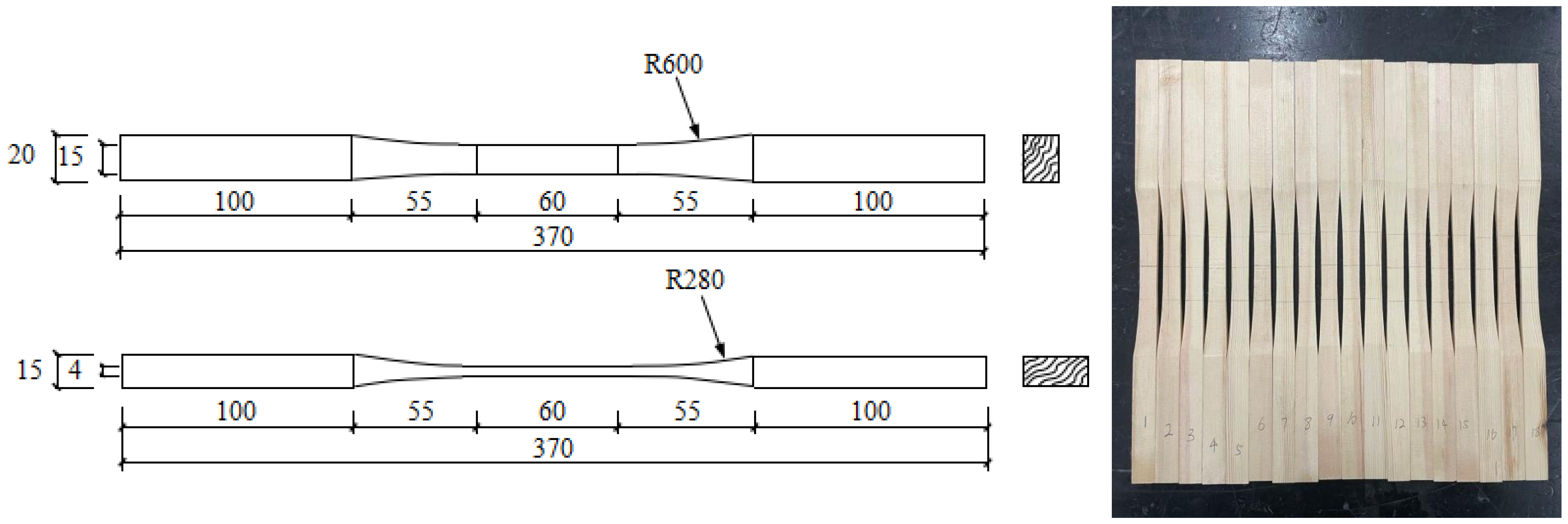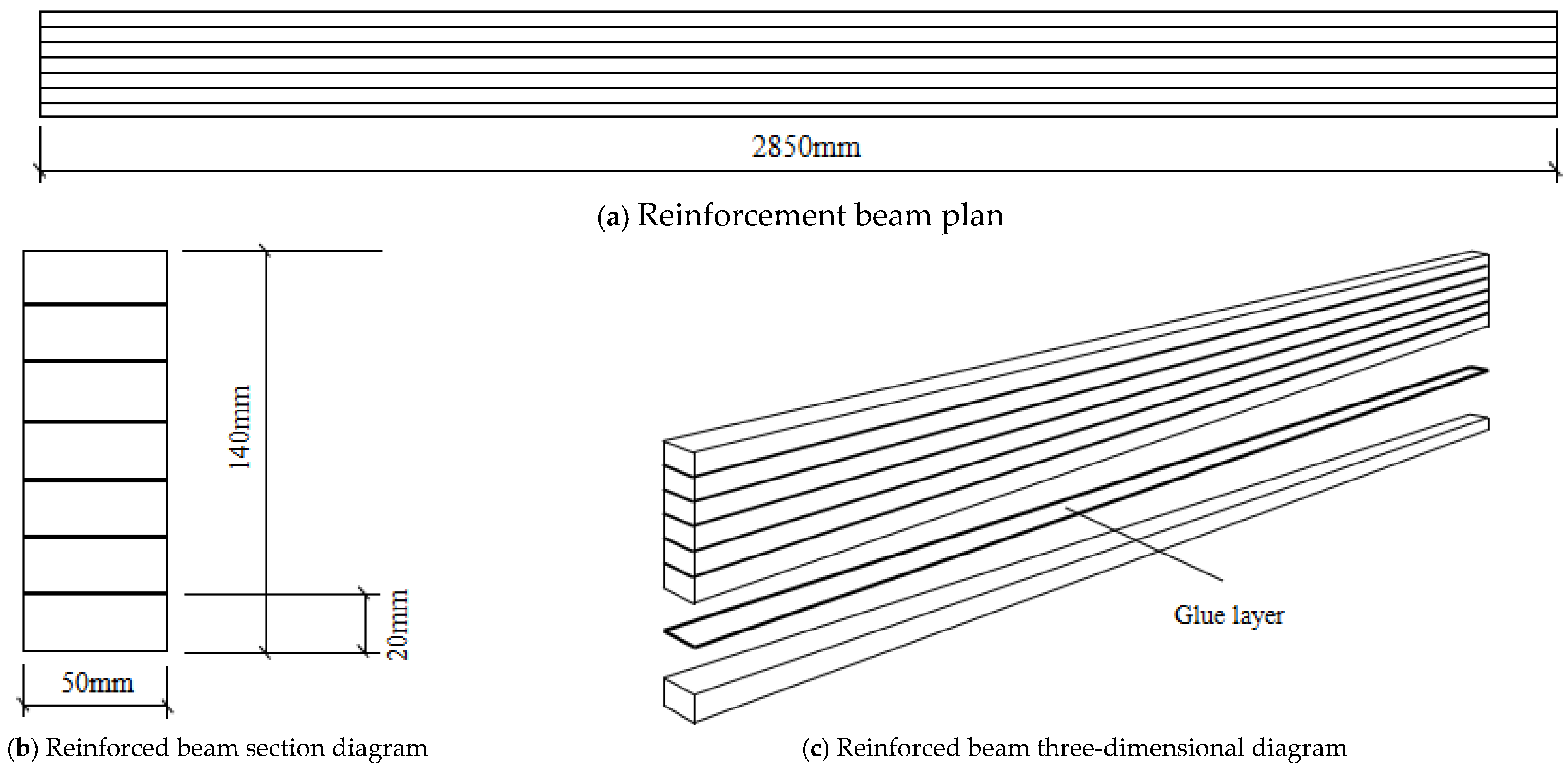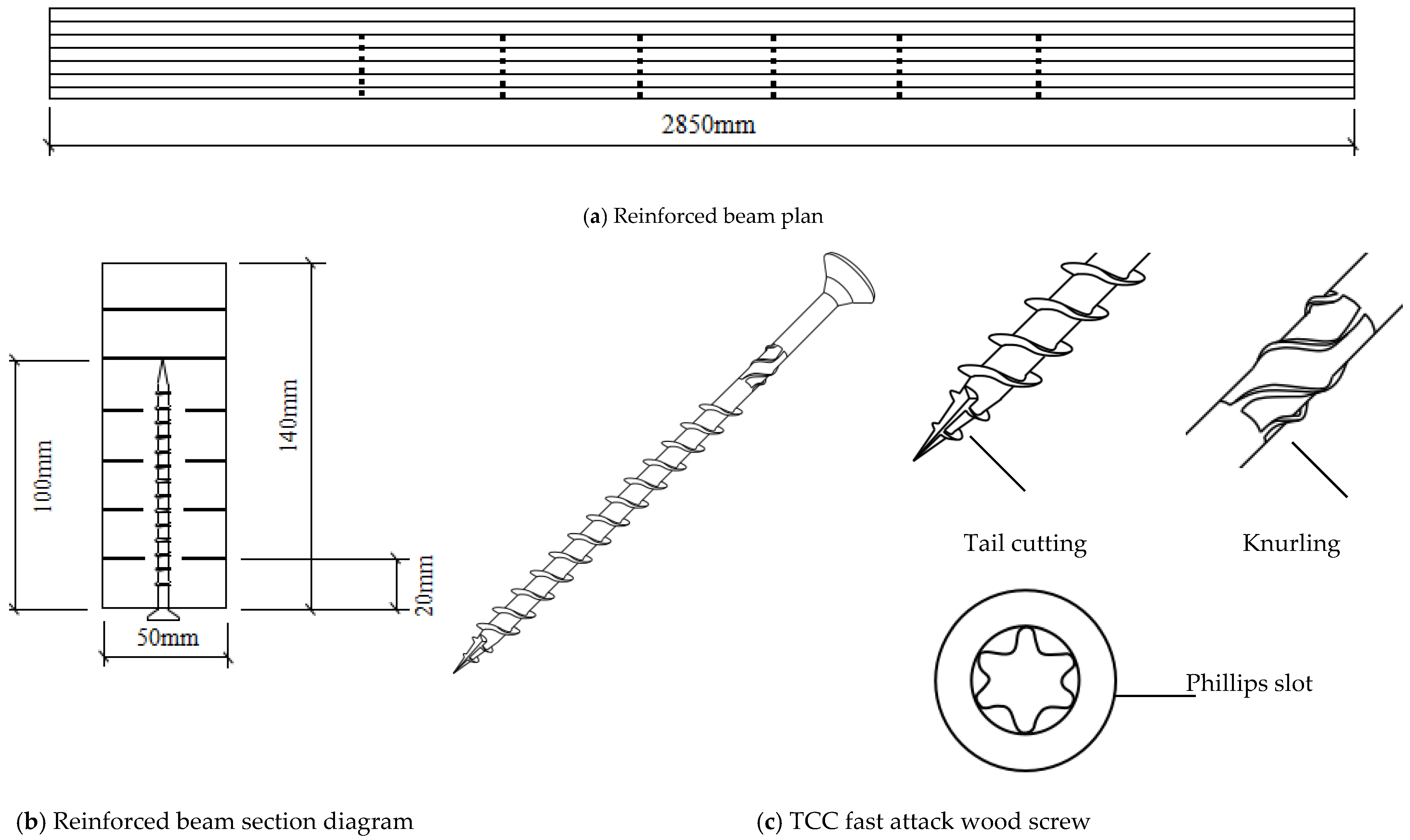 - Hu, B. Experimental Study on the Flexural Performance of Glued Laminated Timber Beams Strengthened by Adhesive Enlarging Section Method. Master’s Thesis, Northeast Forestry University, Harbin, China, 2022. [Google Scholar] [CrossRef]