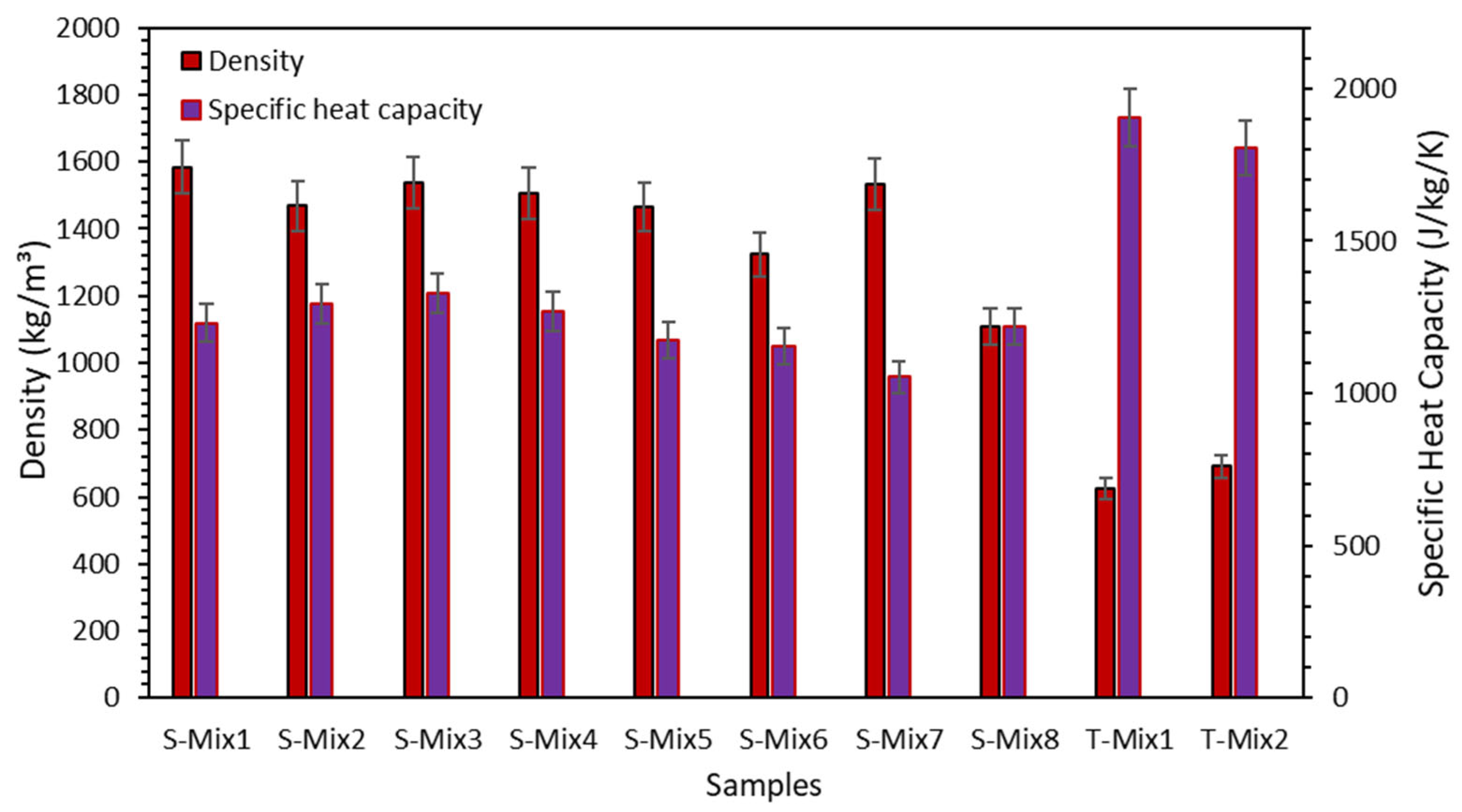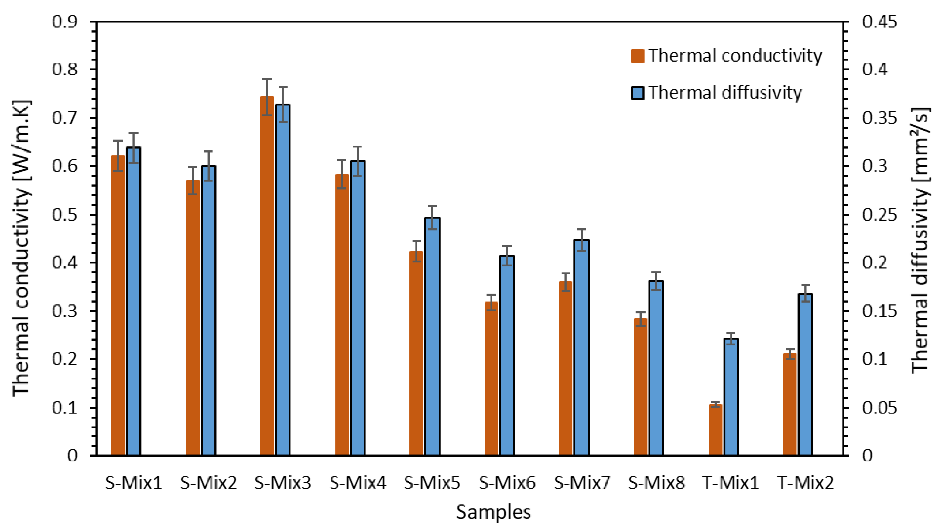 Figure 2. The results highlight a correlation between the mixes’ compositions and their thermal performance. For the structural samples, S-Mix3 represents the highest diffusivity with 0.363 mm