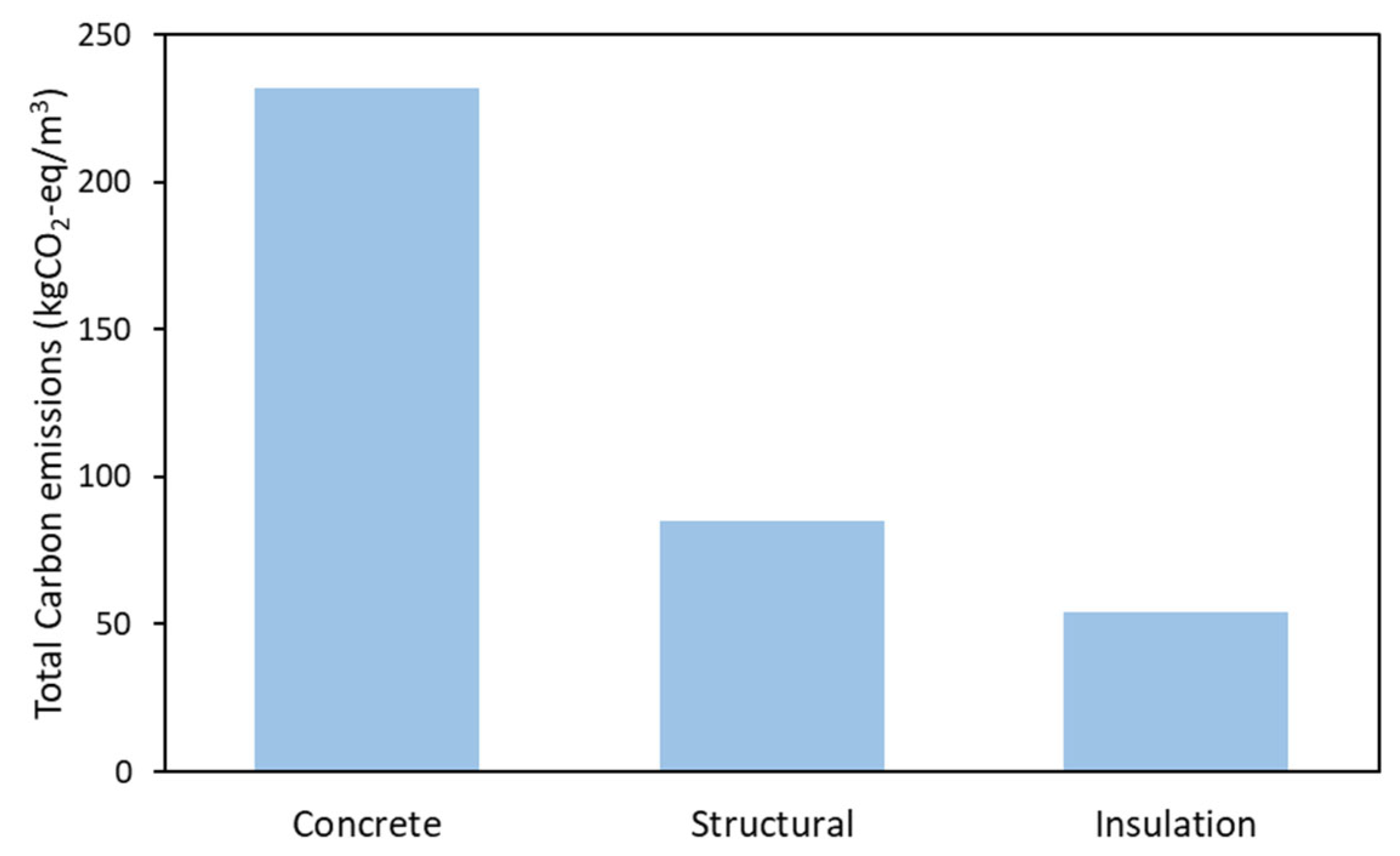 The insulation material, mixed with a high percentage of fibers, has a light density matching the lightweight clay brick’s properties (0.180 kgCO2-eq/kg in the database) and a fiber composition close to the straw bale for construction material (0.096 kgCO2-eq/kg). Thus, the insulation material is situated between these two materials, with an estimation of an environmental impact close to 54 kgCO2-eq/m3, representing a reduction of approximately four times in comparison with concrete.