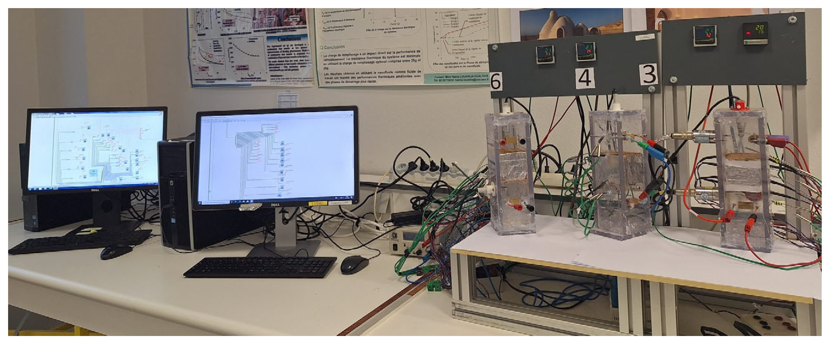 . Each test lasts around 5 days in order to verify the stabilization condition. Each specimen is equipped with embedded temperature sensors and humidity sensors connected to an NI acquisition system, which enables measurements of real-time display and records within a time lap of 600 s. A user LabView interface, as shown in