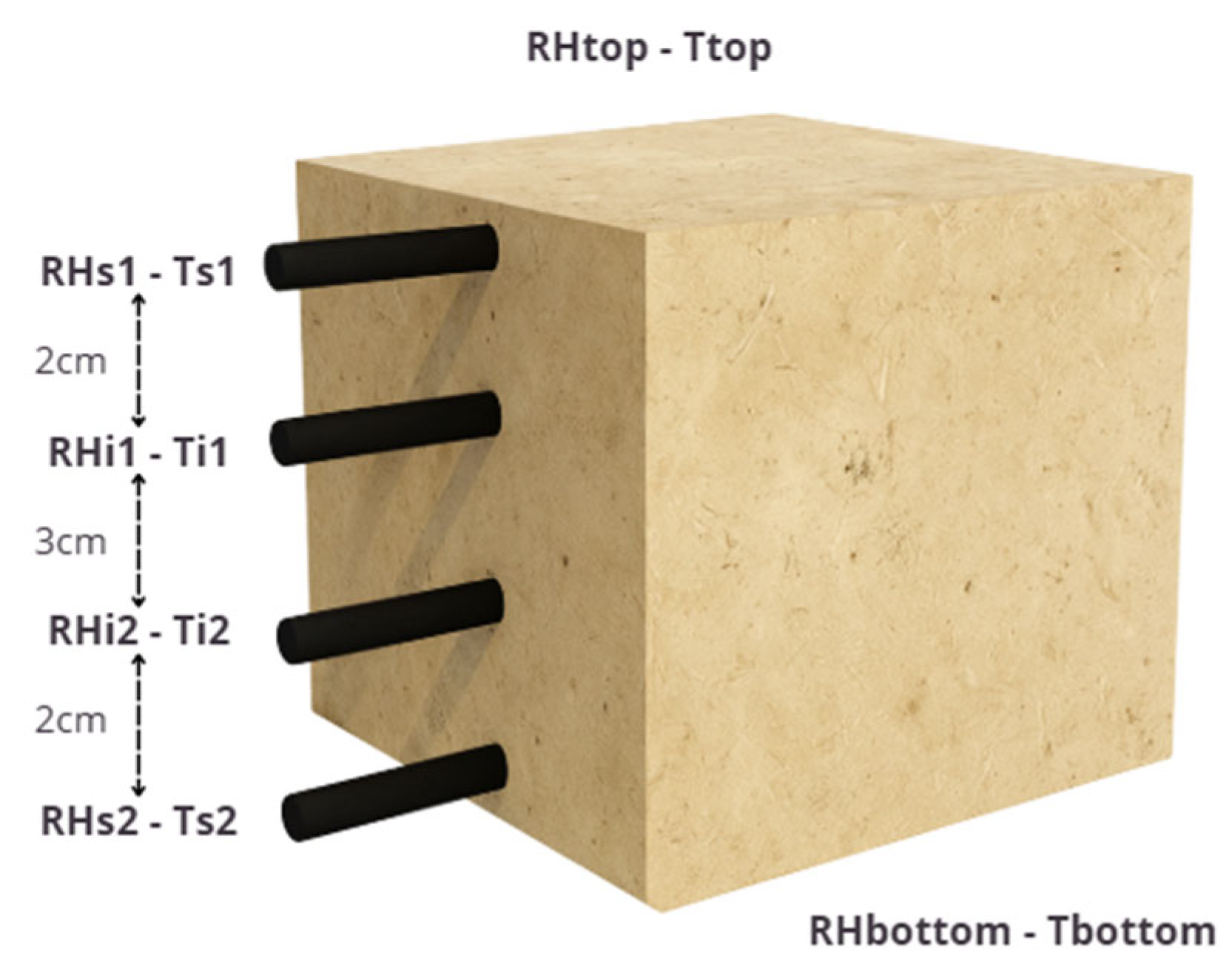 Figure 6, where 8 hygrometer sensors are used. Two hygrometers are set in the lower and upper surface of the cob mix, and two internal hygrometers are set from each side, with 2 cm depth and 2 cm distance from each other. Eight K-type thermocouples
