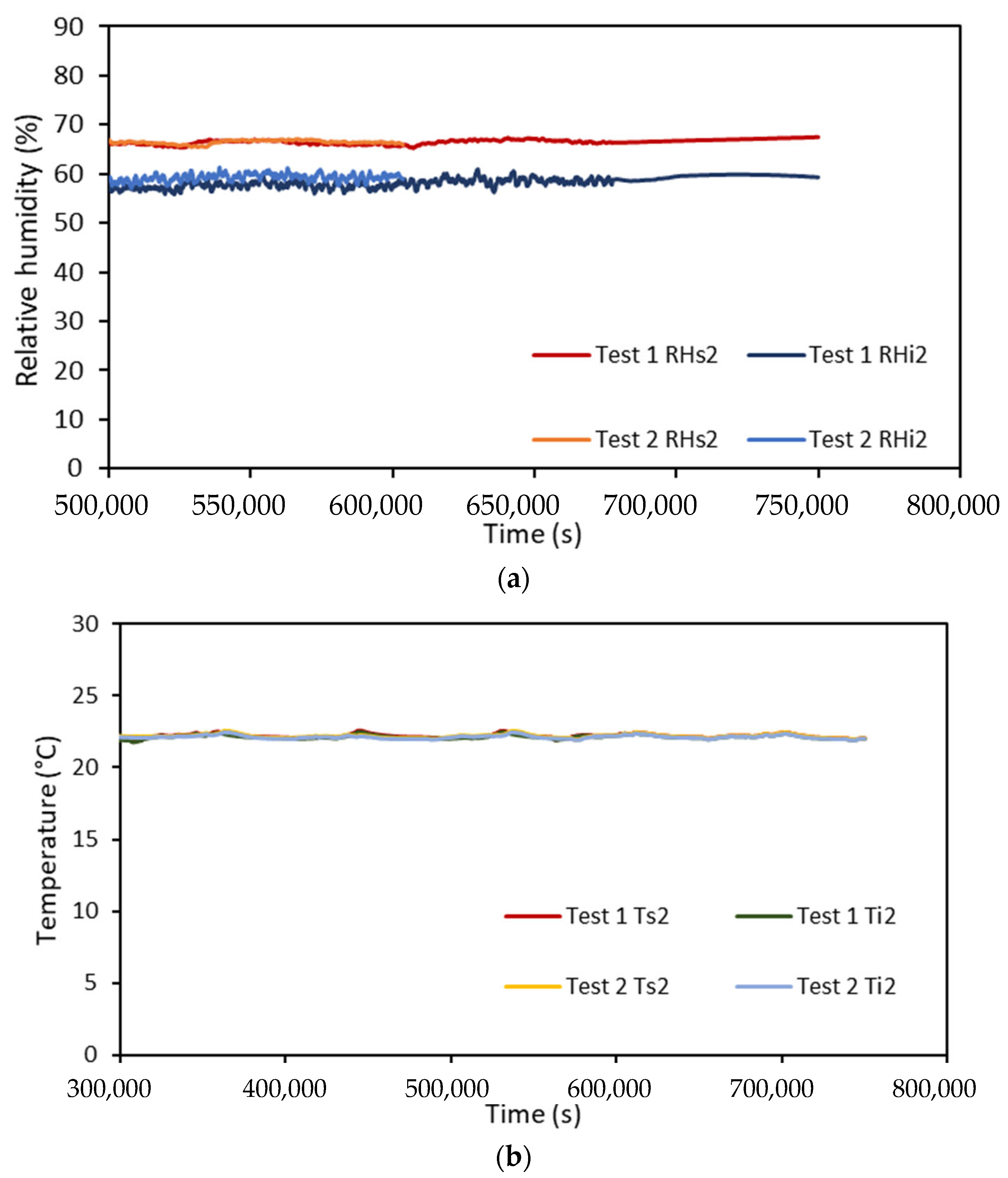 Figure 7a,b are the ones obtained in the tests on the structural sample using NaCl solution in the equilibrium state, which was noted in the two compartments after approximately 5 days, in which the ambient relative humidity stabilized at 68% in the bottom ambience RHbottom. Fluctuations were observed in the obtained results, leading to a statistical analysis performed on the stabilized portion of the signal in order to confirm their reliability. The average relative humidity for the sensor RHs2 for the first test was 65.72%, against 66.63% for the second test, with a maximum standard deviation of 1.18%. For RHi2, an average of 56.48% for the first test was calculated, against 57.92% for the second test, with a maximum standard deviation of 3.073%. These fluctuations are consistent with the intrinsic noise level of RH sensors. A smoothing filter was applied to highlight the physical trend and is presented in