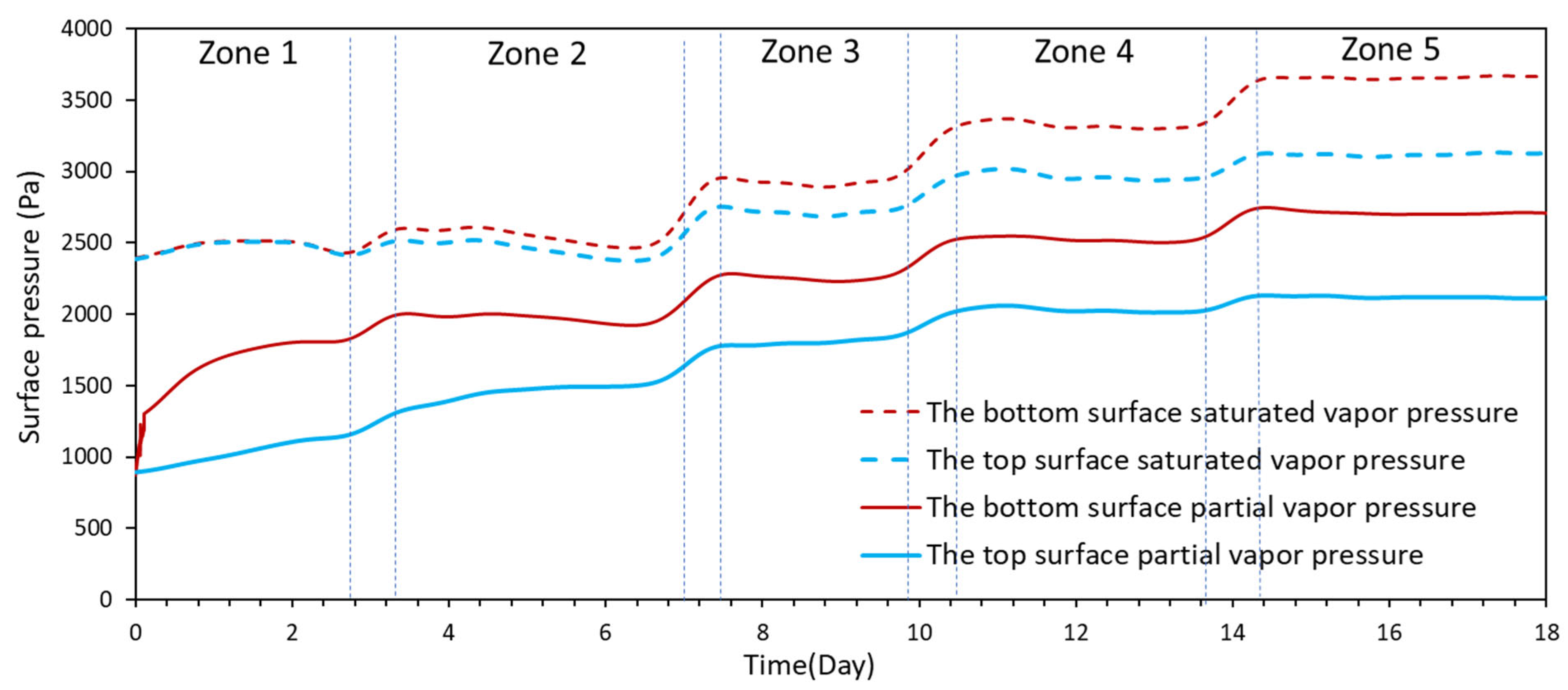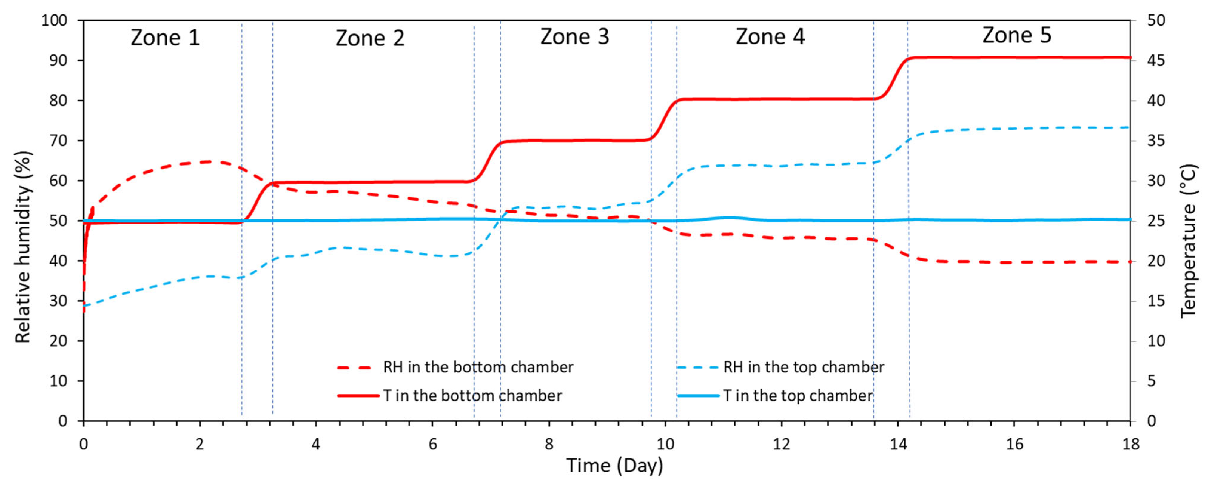 Figure 8 for the compartment ambiences highlight the hygrothermal dynamics caused by the imposed conditions. In the lower side, the relative humidity initially increases to approximately 65% as a result of the presence of the saline solution. During the first period of the test (Zone1), with both compartments at the same temperature 25 °C, an increase in relative humidity was also observed in the upper compartment as vapor migrated from the lower compartment and the material gradually desorbed. When the temperature of the lower compartment increases, it causes an increase in saturated vapor pressure in the lower part, leading to a decrease in the relative humidity at the bottom side, and thus RH increased at the top by moisture migration, progressively reversing the RH levels between the two sides, starting from when the temperature at the bottom reaches 35 °C. In the following zones (4 and 5), when the lower temperatures were raised to 40 °C and then 45 °C, the thermal gradients became more pronounced, causing a more marked effect on relative humidity. RH continues to decrease at the bottom, while the vapor at the top side was at a lower temperature, which increases the measured relative humidity. The difference between the two compartments reaches nearly 40%, illustrating an inversed relative humidity gradient, from the top to the bottom, while heat moved from the bottom to the top.