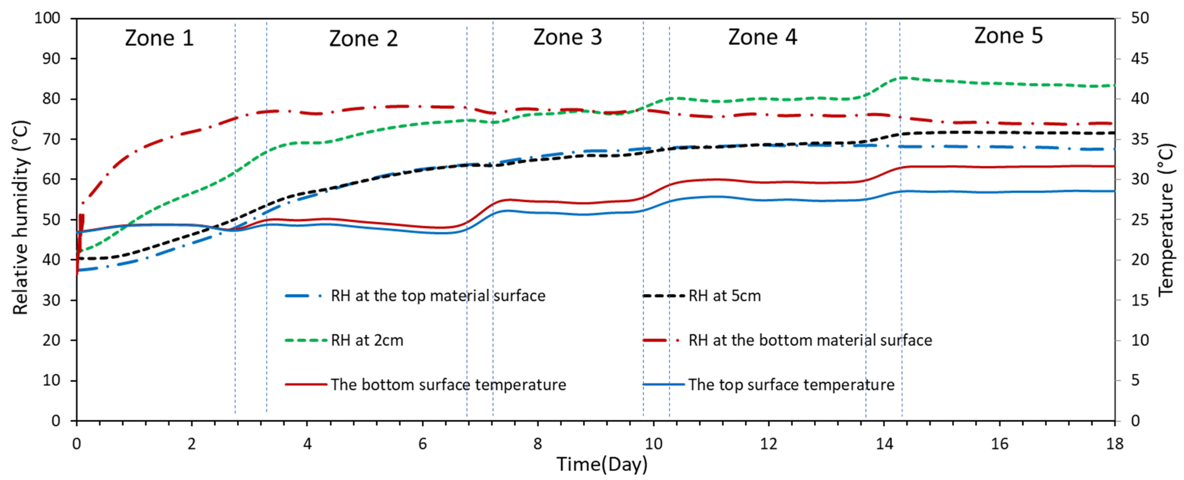 Figure 9 represents the variations in temperature and relative humidity inside and on the surfaces of the sample. The lower surface’s relative humidity increases in the first, due to the source of humidity. While the temperature at the bottom ambience is increased in steps. The measured relative humidity shows a decrease, which can be explained by the increase in the saturated vapor pressure. At 2 cm from the bottom surface, RH increases progressively until it exceeds the measured RH at the bottom surface. As mentioned above, starting from 35 °C, the relative humidity levels in the ambiences reverse, which caused the appearance of maximum RH inside the material, at 2 cm. The area located at 2 cm remains cooler than the lower surface while receiving an increasing amount of vapor, making that its saturated vapor pressure is lower than that of the heated surface. This explains the higher internal relative humidity in this location. At 5 cm, the relative humidity also increases over time, showing the progression of the humidity within the sample, but remains lower than that of the bottom surface. This is due to the distance from the source of moisture and the influence of conditions on the top compartment, which was initially drier. The same trend is followed by the relative humidity measurements in the top surface, with nearly combined curves. However, when the lower temperature reaches 45 °C, there is a slight increase in relative humidity at 5 cm. At this stage, the increase in temperature at the bottom greatly intensifies the moisture migration of vapor through the material, enabling the vapor to reach the 5 cm area more efficiently.