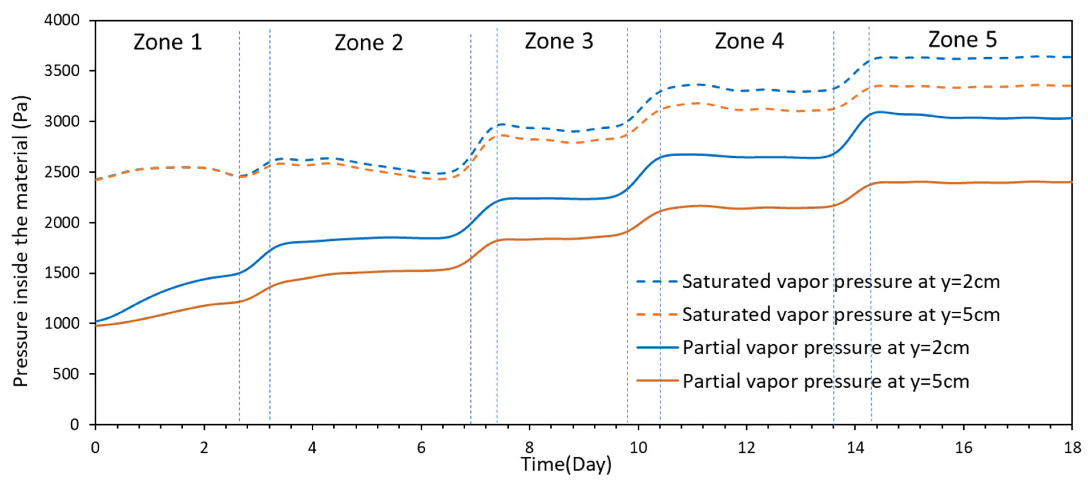 Figure 11 show that in all of the measured positions, the partial vapor pressure never exceeds the local saturated vapor pressure corresponding to the local temperature, indicating that the water vapor remains in the vapor phase, without transitioning to the liquid phase and condensing.