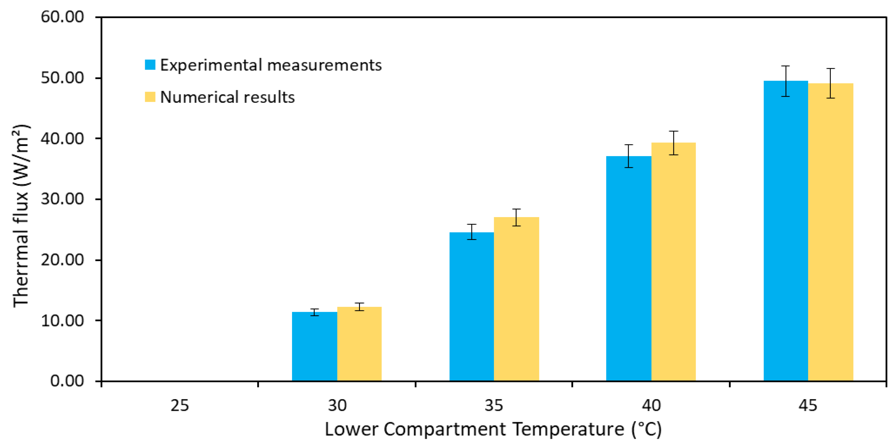 Figure 13 shows the comparison between the model’s calculated heat flux according to Fourier’s law and the experiment flux obtained from the temperature measurements by the sensors, allowing for the estimation of the real heat flux. Good agreement is observed between the two, with a maximum absolute error of 0.3 W/m