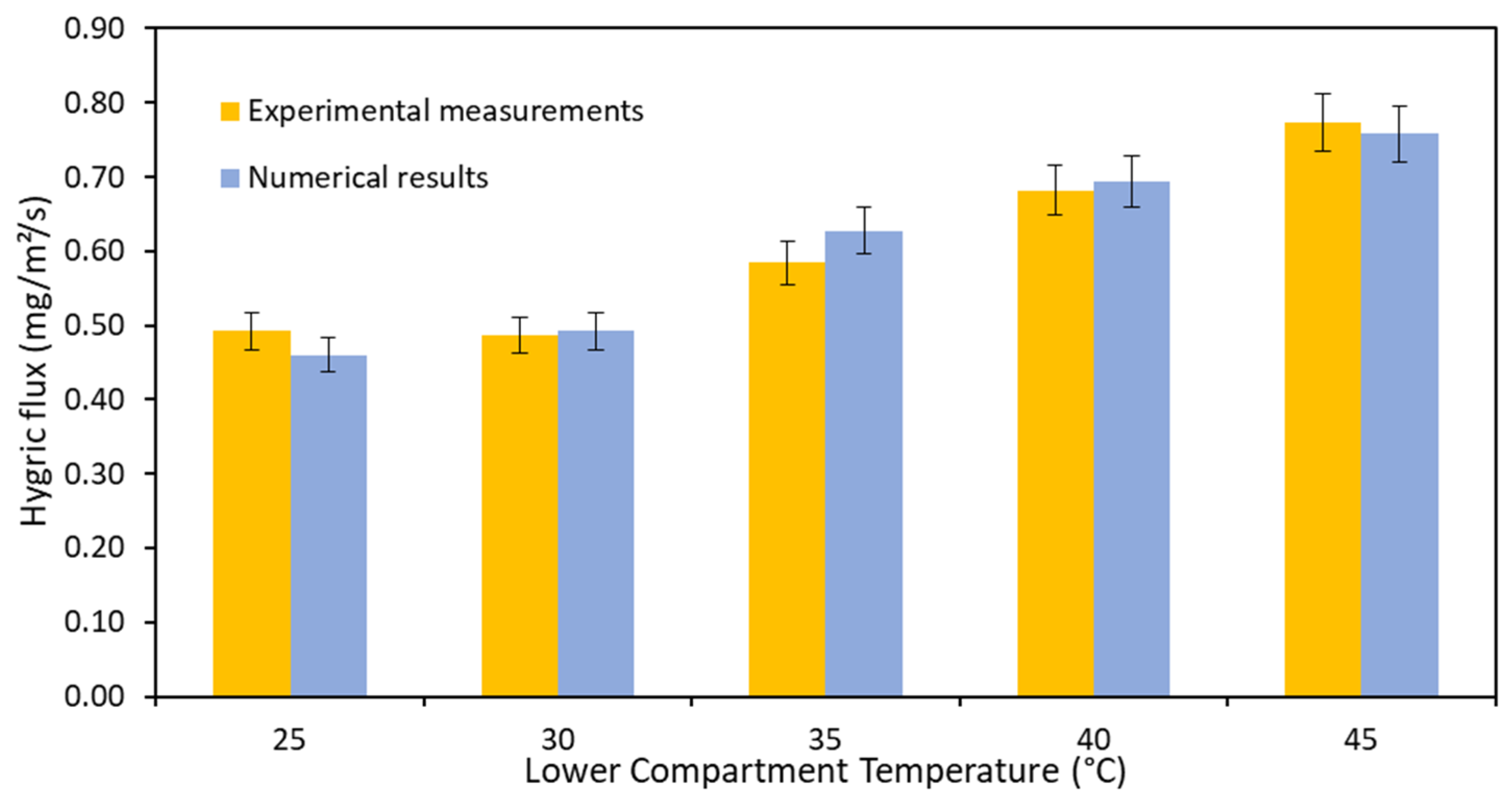 For lower and upper compartments of 25 °C, there is an important hygric flux due to the important humidity gradient, with a gap of 29% between both ambiences. However, for the lower compartment temperature of 30 °C, temperature gradient occurs inside the material, and the top RH increase is observed at the same time, due to the moisture diffusivity, as mentioned in the experimental section. This explains why, at 30 °C, the moisture flux is close to that of 25 °C, as the slight increase in temperature is compensated by the reduction in the humidity gradient. From 35 °C to 45 °C, the thermal gradient is intensified, and therefore the hygric flux is increased, also due to the increase in the saturated vapor pressure with temperature.