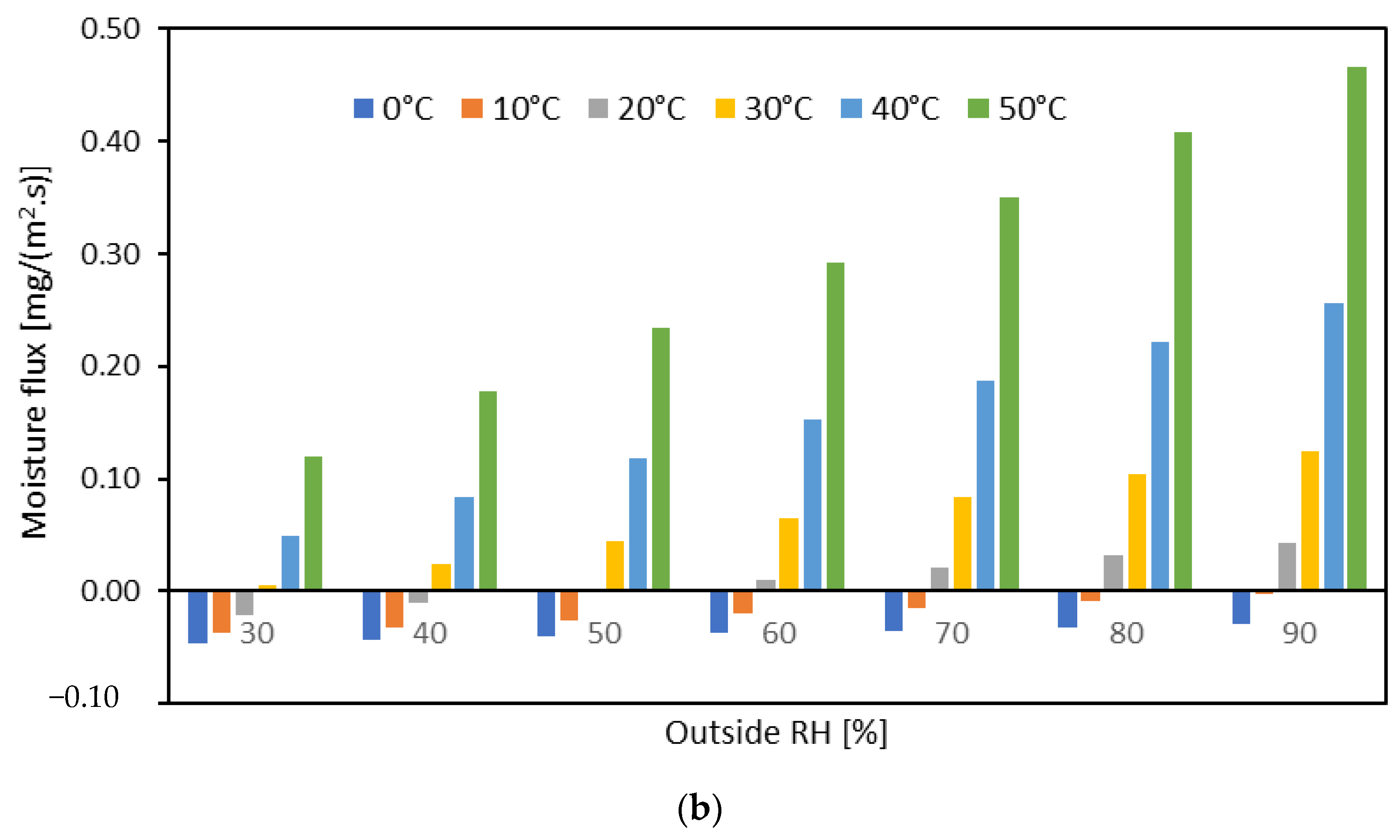 Figure 16a,b show that heat and hygric fluxes respectively for different RH and outside temperatures. Heat flux between inside building at 20 °C and the outside with temperature varied from 0 °C to 50 °C, shows a heat loss to the exterior for 0 °C and 10 °C. No heat flux for 20 °C due to no thermal gradient between the two ambiences. A heat gain to the exterior due to the increase in temperature starting from 30 °C. The heat flux remains identical for all the exterior relative humidities cases studied. However, the hygric flux presents a more dynamic behavior, because it depends on the partial vapor pressure, itself controlled by both the relative humidity level and the temperature through saturated vapor pressure.
