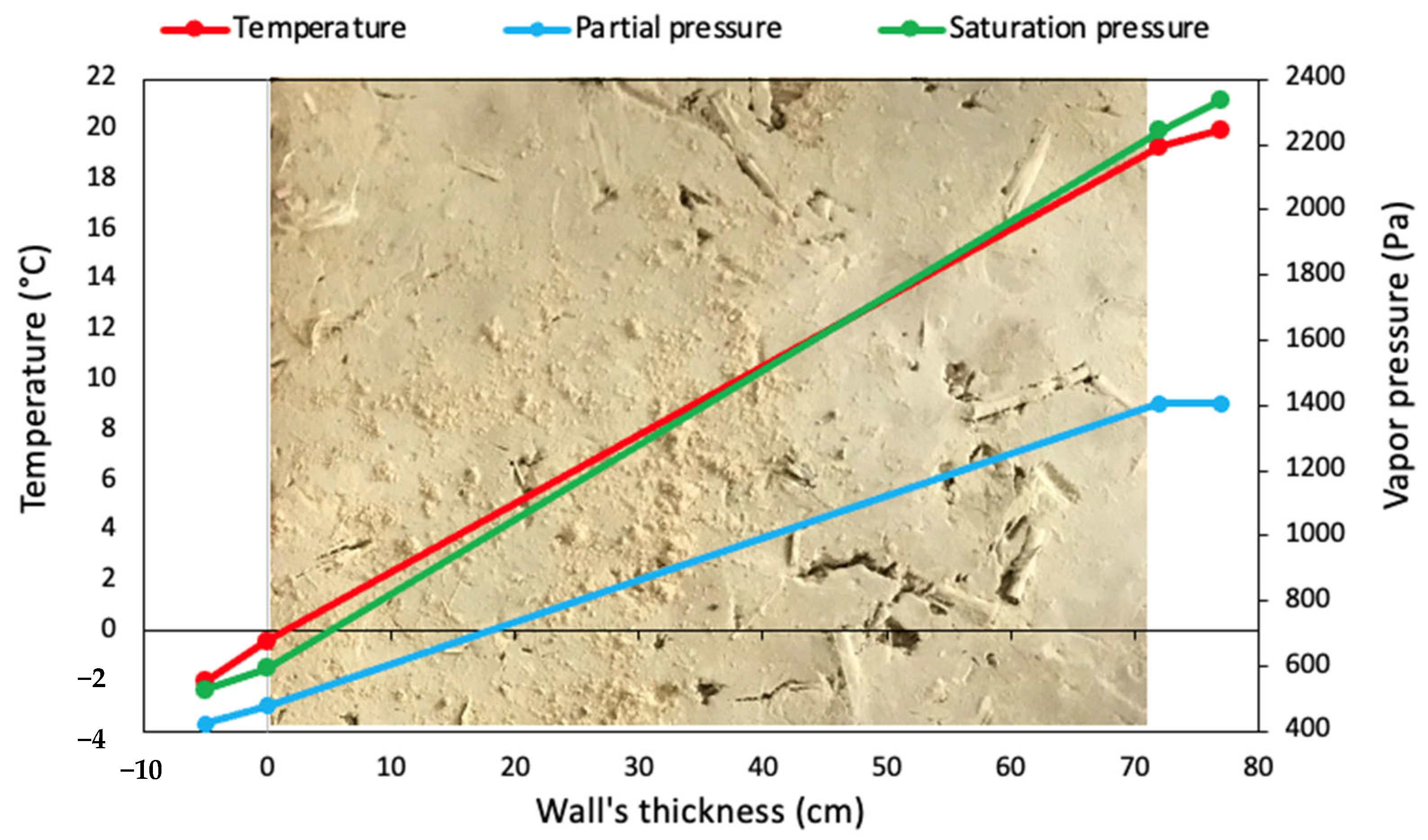 For the structural material alone, preliminary tests were performed on the temperature and relative humidity conditions from the experimental tests realized and mentioned above and were evaluated in order to assess any condensation risk, but no risk was detected, confirming the conclusions drawn from the obtained measurements. However, real winter conditions were also tested on a structural wall of 72 cm thickness, with harsh, cold temperatures, where Tint = 20 °C and Rhint = 60%, and for the exterior conditions, RH was fixed at 80%, with the variation in Text from −2 °C to −10 °C. A risk of condensation was identified until the exterior temperature reached −10 °C, where there is an intersection between Psat and Pv curves in the internal side.