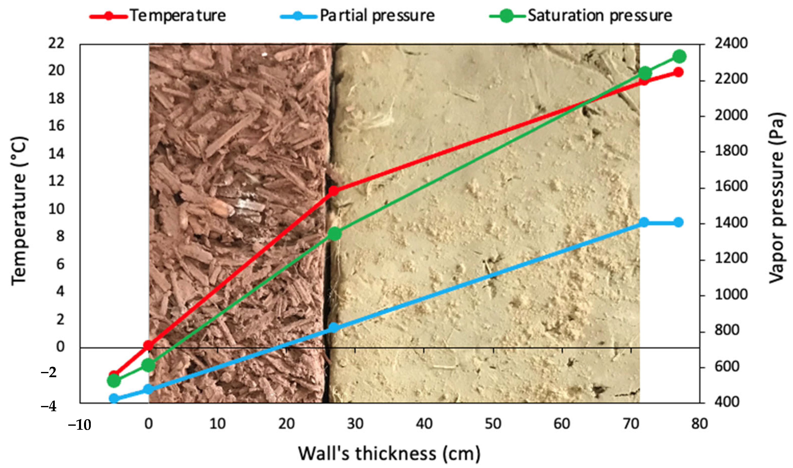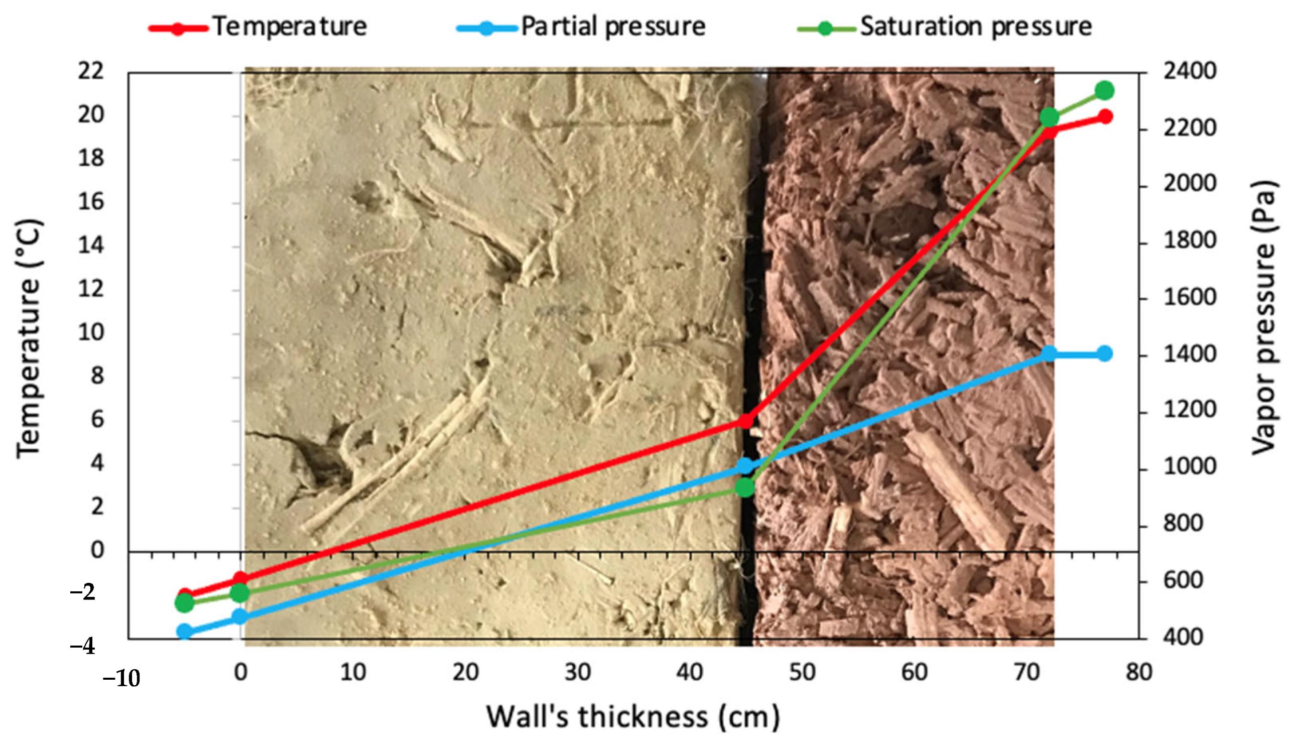 25]. The choice of materials and their composition govern the wall’s thermal inertia, thus heat transfer influences vapor migration and moisture accumulation in the wall. It was demonstrated that fiber dosage influences heat and moisture transfer [
