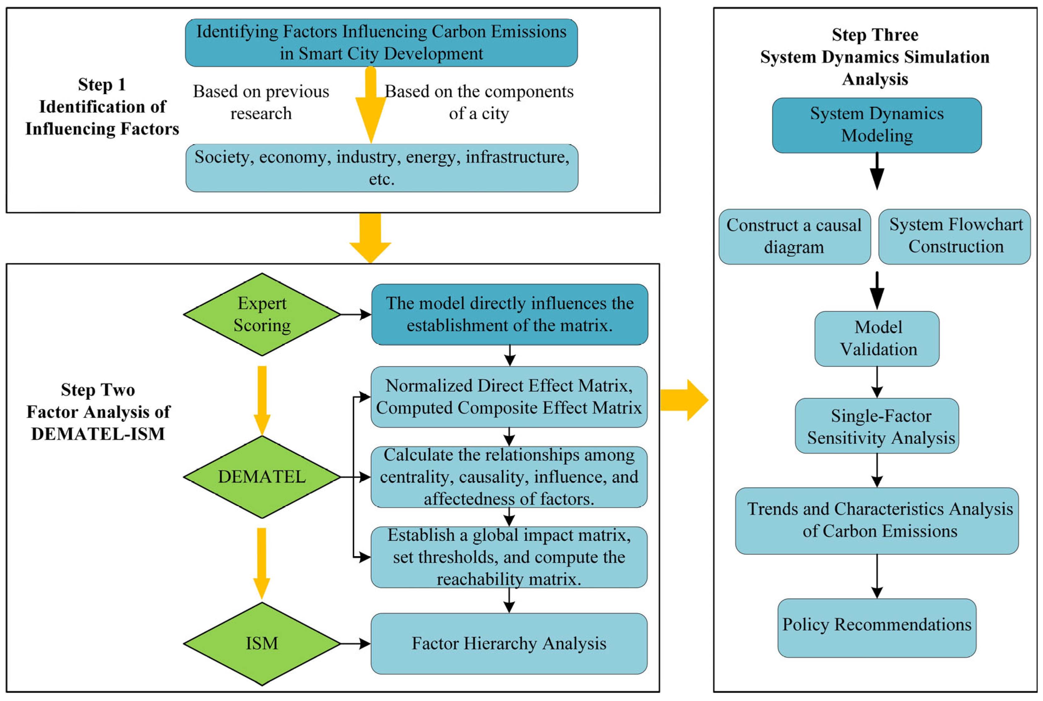 To address these shortcomings, this study integrates DEMATEL, ISM, and SD into a unified framework. DEMATEL is used to quantify the causal influence among factors; ISM organizes these factors into a multi-level hierarchy; and SD models their dynamic interactions and feedback loops over time. This hybrid approach enables a more comprehensive analysis of SC carbon emission mechanisms and provides a structured basis for exploring targeted urban low-carbon strategies. The overall methodological framework of this study is illustrated in Figure 1.