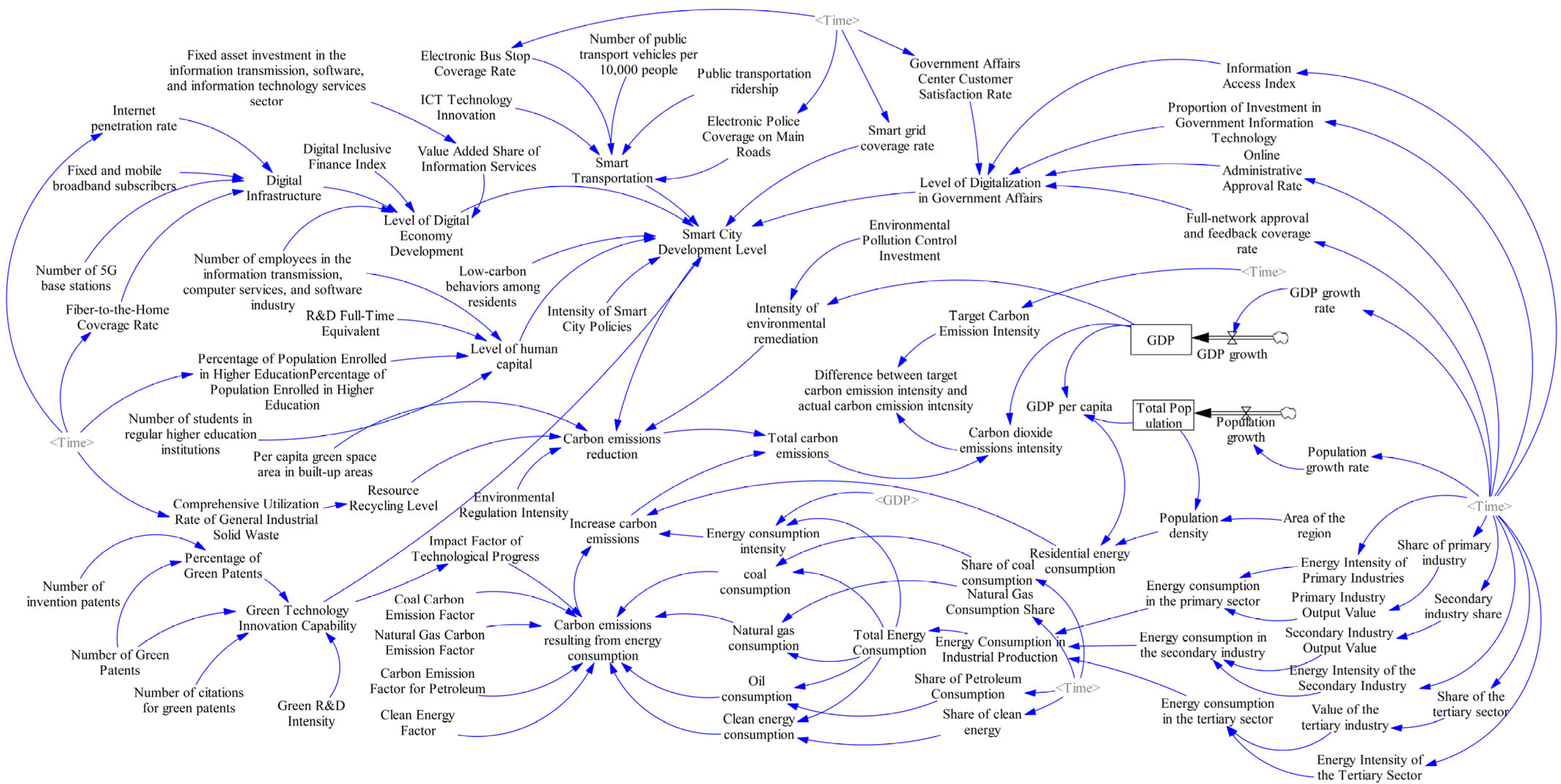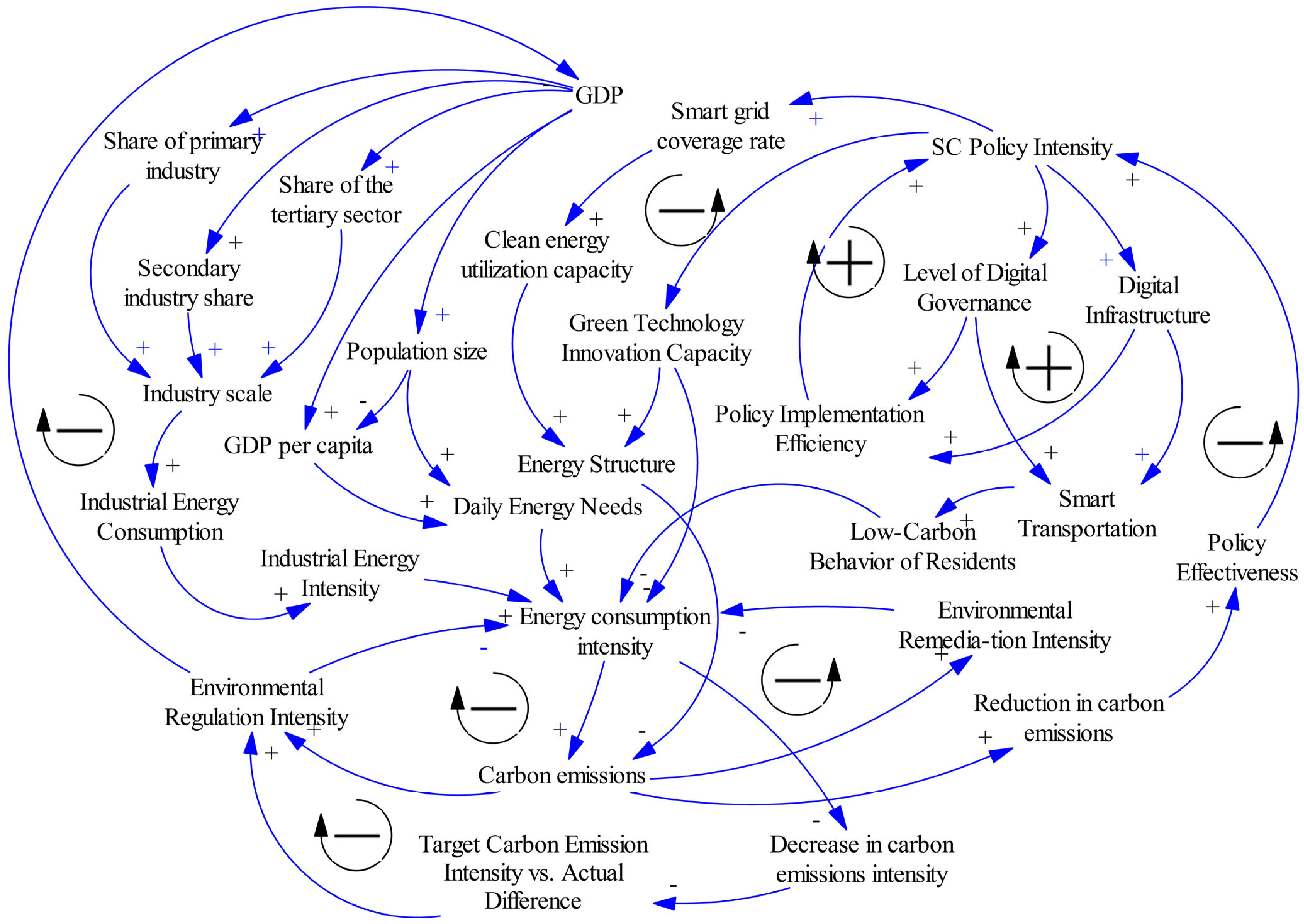 Moreover, current studies primarily focus on the isolated effects of specific SC components—such as digital governance, intelligent transport, or the digital economy—while neglecting the internal feedback loops and multi-level influence pathways within the broader urban carbon emissions system. Another limitation is that most empirical studies adopt quasi-experimental or regression-based methods that provide partial insights into causality but rarely explore the structural relationships among factors or simulate their dynamic evolution over time. As a result, policy makers often lack an integrated understanding of how SC interventions propagate through different subsystems to ultimately shape carbon emission trajectories.