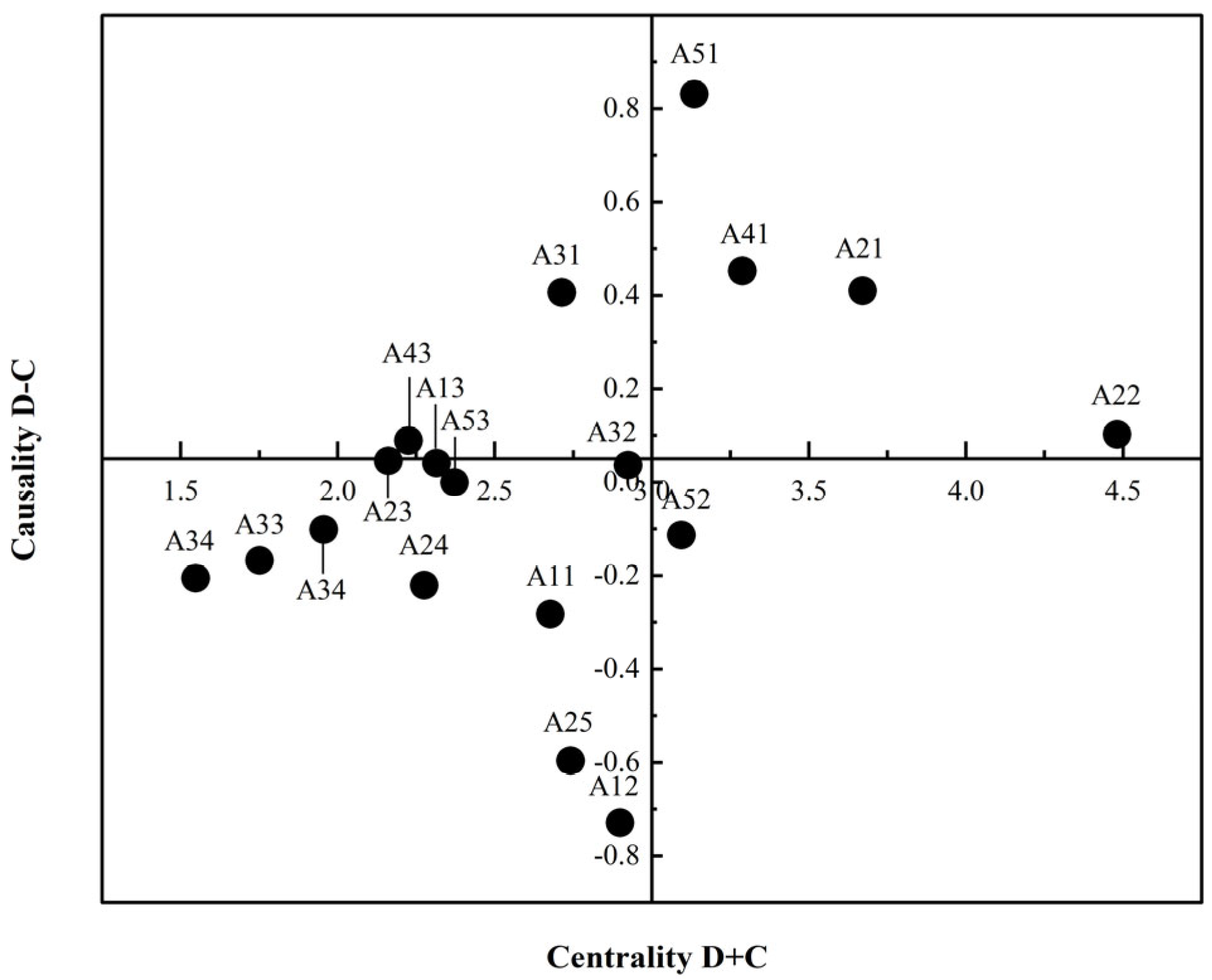 Centrality represents the overall strength of a factor in both influencing and being influenced, reflecting its degree of association with other factors. Causality indicates the direction and nature of influence. If a factor exhibits positive causality, it strongly influences other factors and is a causal factor; conversely, negative causality indicates it is more susceptible to influence from other factors and is a resultant factor.