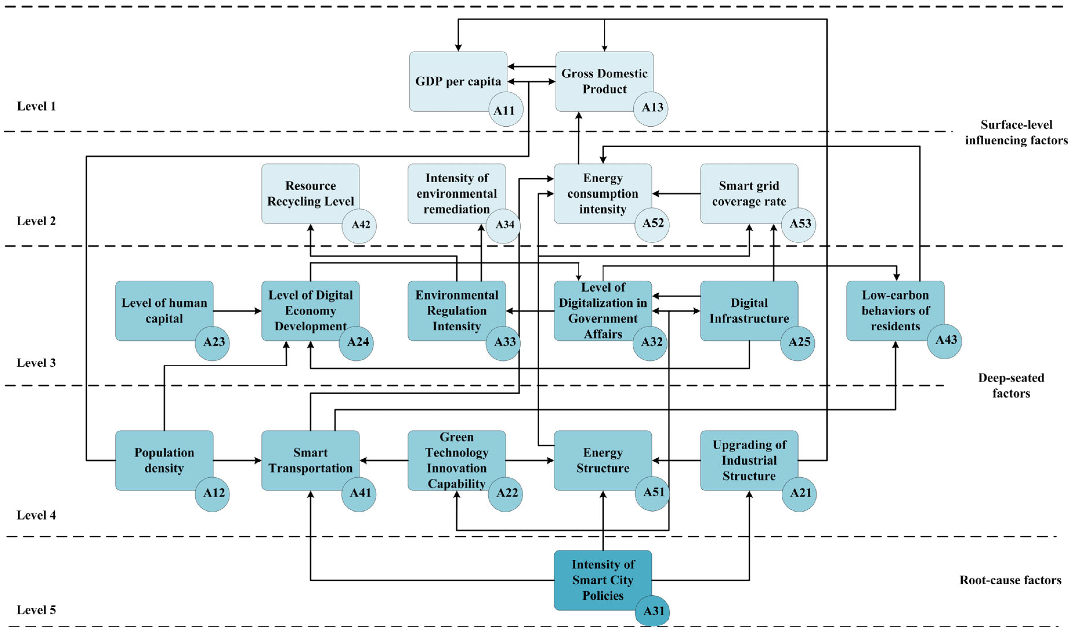 The second category applies machine learning, digital twin modeling, and traditional statistical methods to forecast energy demand and carbon emissions or to identify key influencing factors. Approaches such as double machine learning [30] digital twin–based energy modeling [31], and regression analysis [32] help improve prediction accuracy and factor identification. However, they often require large volumes of data, rely on stringent identification assumptions, and provide limited insight into the internal structure of factor interactions. Furthermore, these models usually lack visual interpretability and are not designed to explicitly represent multi-level causal hierarchies or feedback loops.
