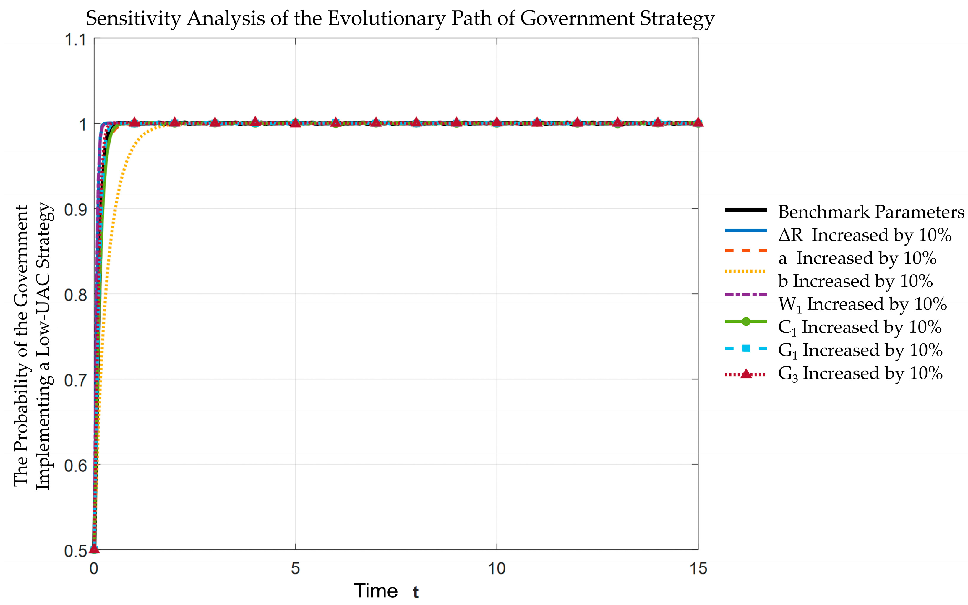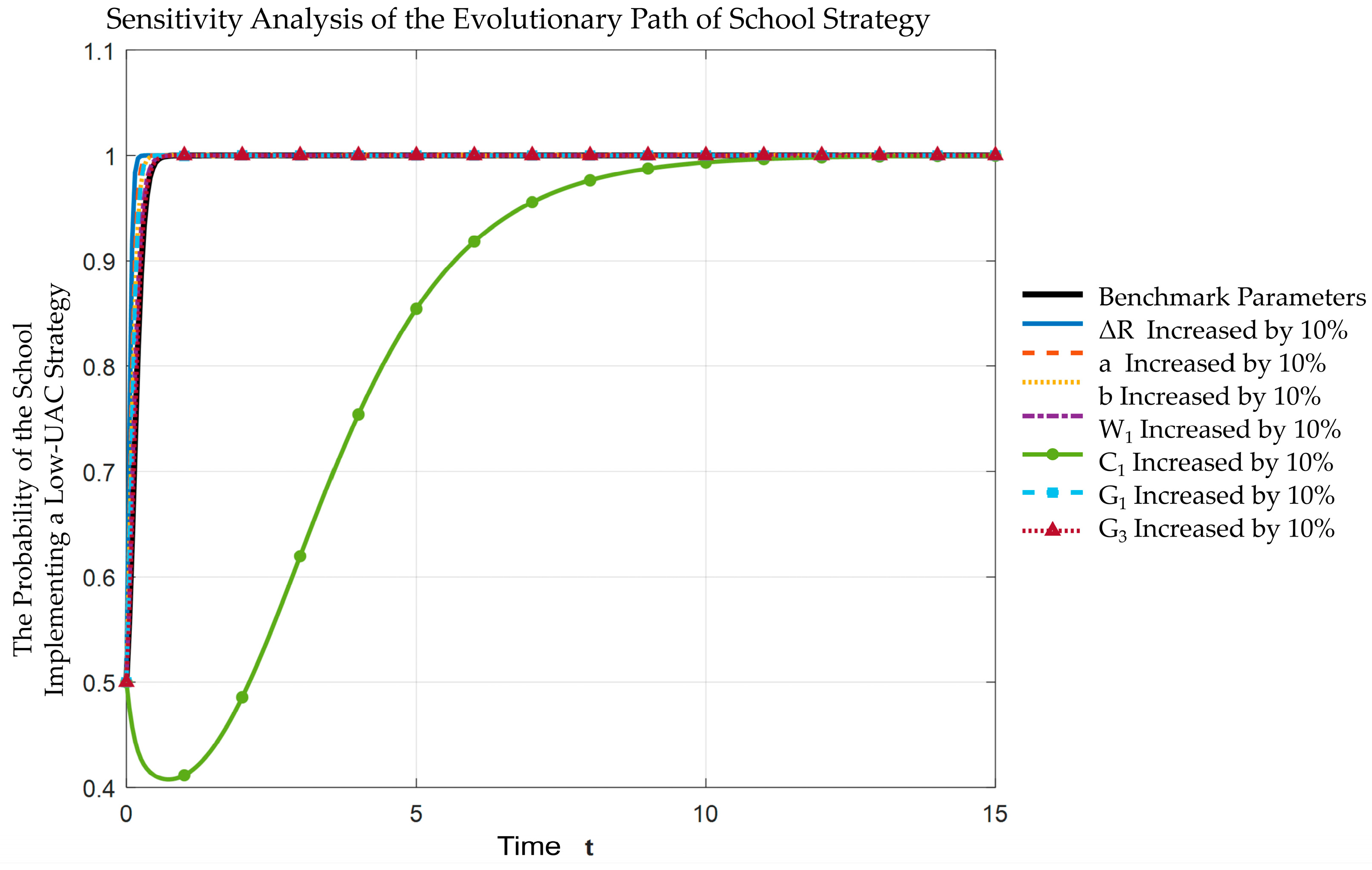 - Conditions for Evolutionarily Stable Strategies: When the incremental comprehensive benefit of a low UAC (ΔR) exceeds 150,000 yuan/class and the government’s risk compensation to schools (W1) surpasses 80,000 yuan/class, the system converges with a probability of no less than 0.8 to a low UAC range (0.48–0.53). Under these conditions, the stakeholder strategy combination (E8(1,1,1)), namely, “active government implementation–schools requesting low UAC–students and parents expressing demands,” emerges as the unique evolutionarily stable strategy, enabling a synergy between intensive land use and well-being spaces.