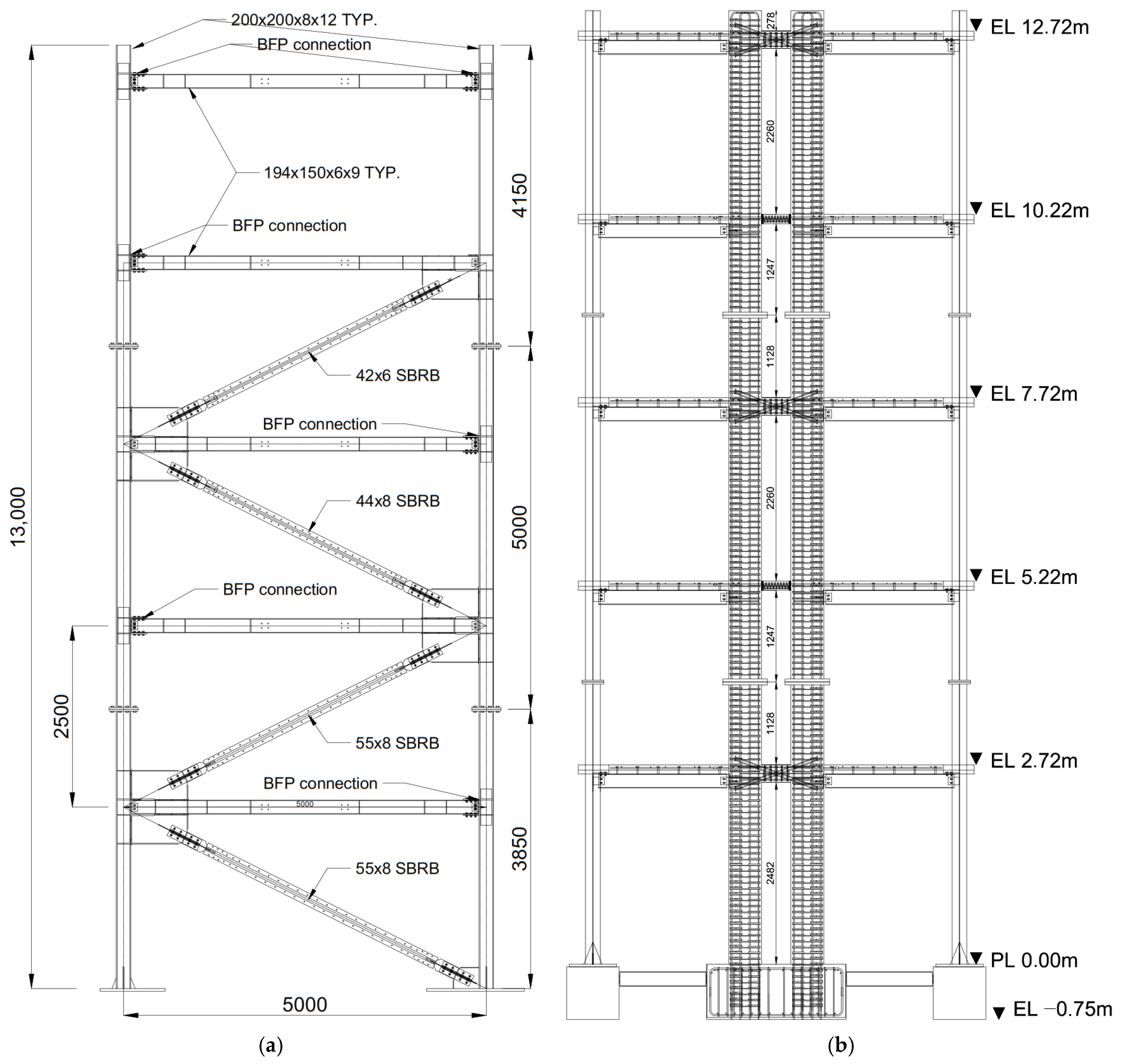 fy = 410 MPa) was selected for all concrete reinforcements. SS400A steel was selected for all structural steel components, including BRBs and gusset plates. The specified yield stress was 205 MPa, and the specified tensile strength was 400 MPa.