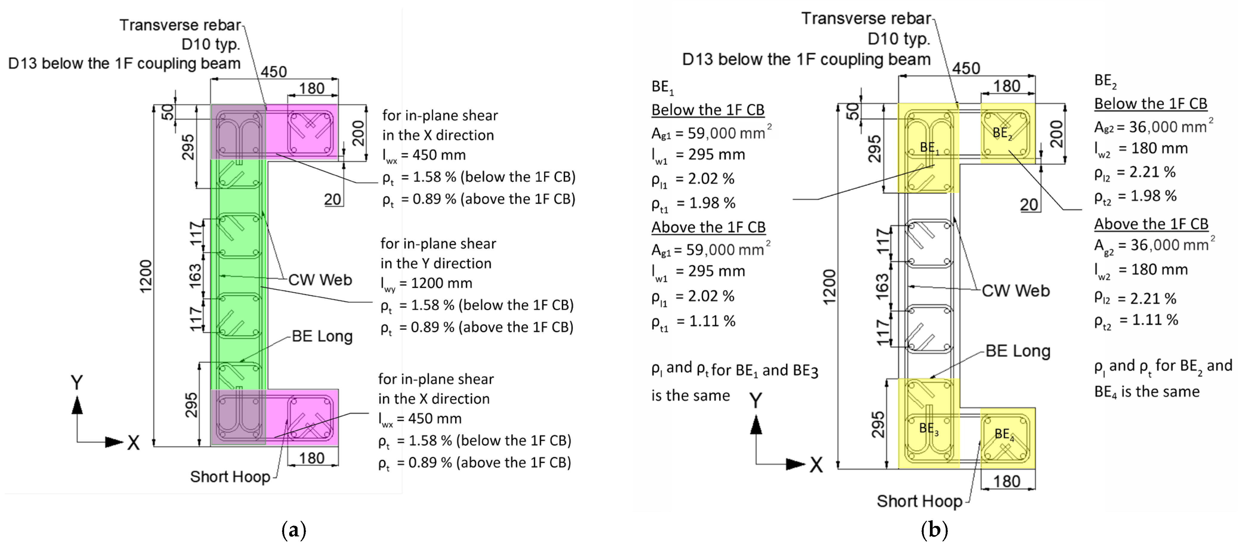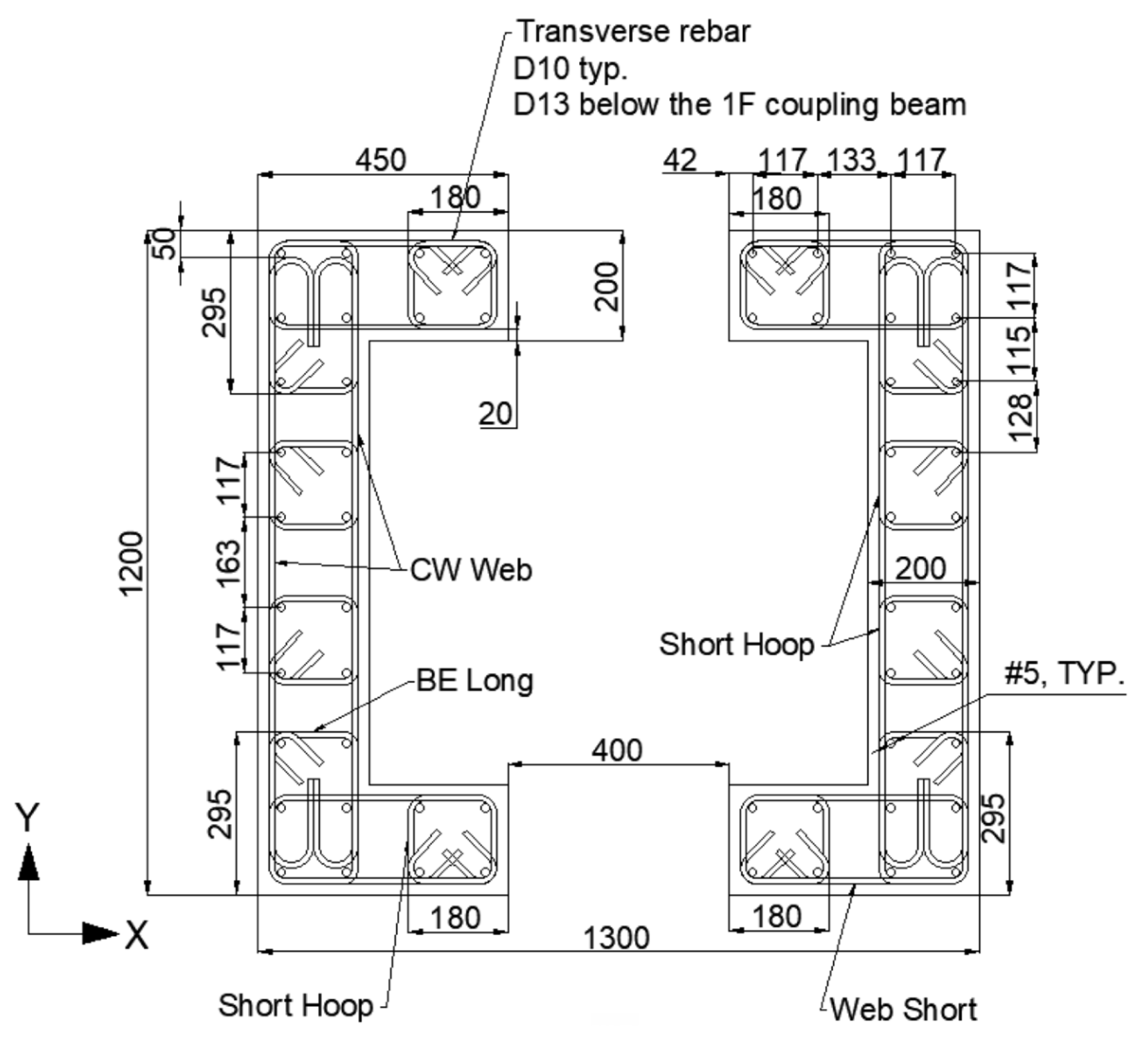 Figure 5b, were confined to enhance the deformation capacity of the concrete. The volumetric reinforcement ratios calculated for the concrete within confining hoop centerlines ranged from 1.11% to 1.98%. Excluding the hoop reinforcement, the continuous transverse reinforcement placed in the coupling wall web (CW web) and flange panels provided transverse reinforcement ratios between 0.89% to 1.58%. Ties were expected to be able to resist the entire shear force, without contributions attributable to the concrete. The total longitudinal reinforcement ratio was 1.60%. In the boundary elements, the longitudinal reinforcement ratios were 2.02% on the long-web side (BE