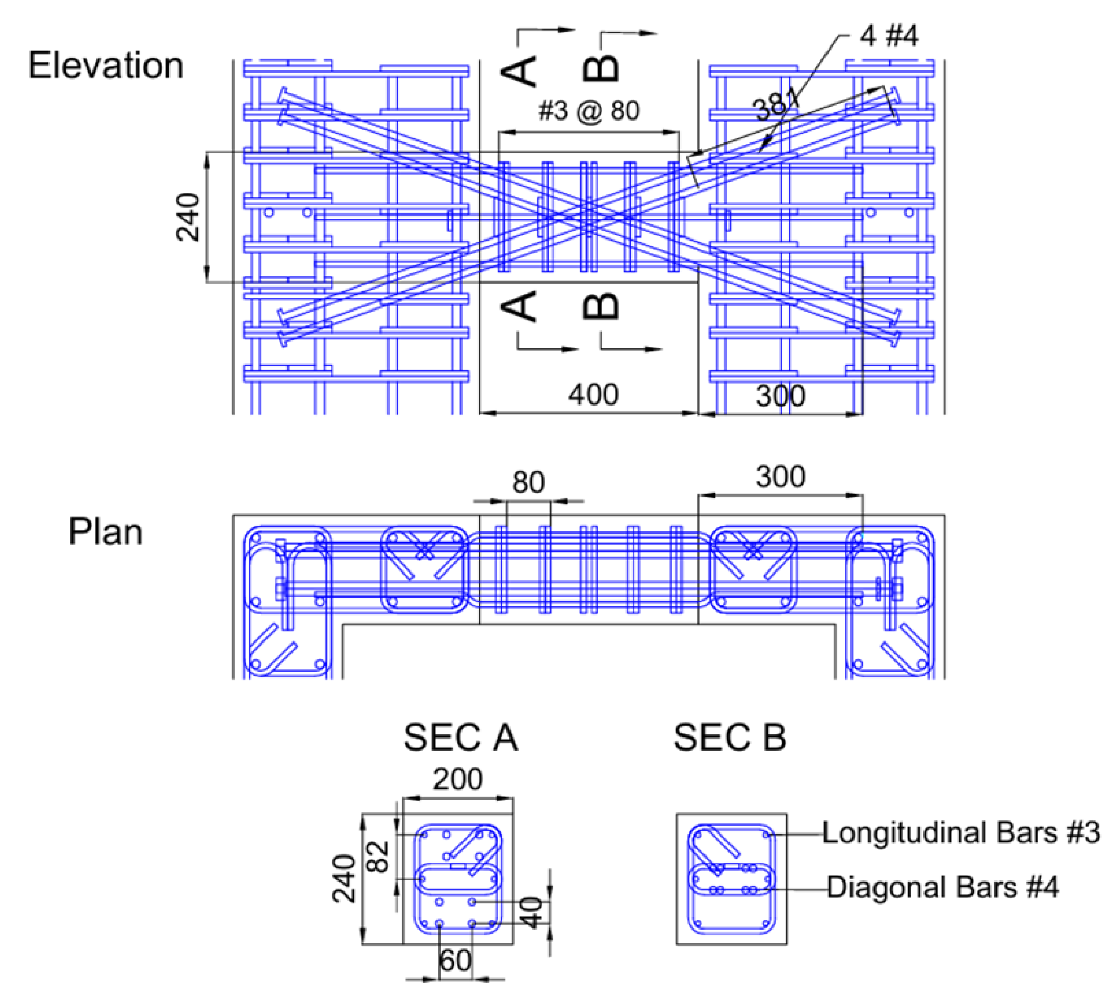 The coupling beams were confined with closed hoops and cross-ties made from #3 bars. The spacing of the ties (80 mm) did not exceed one-quarter of the beam depth or six times the diameter of the longitudinal bars, and one hoop was positioned within 50 mm from the wall face to improve confinement near the interface. The reinforcement detailing and member dimensions were chosen to ensure that the expected chord rotation under the reference (or design) earthquake does not surpass 3.5% or the rotational capacity observed in tests of similar beams, noting that a greater span-to-height ratio may result in increased beam chord rotation [