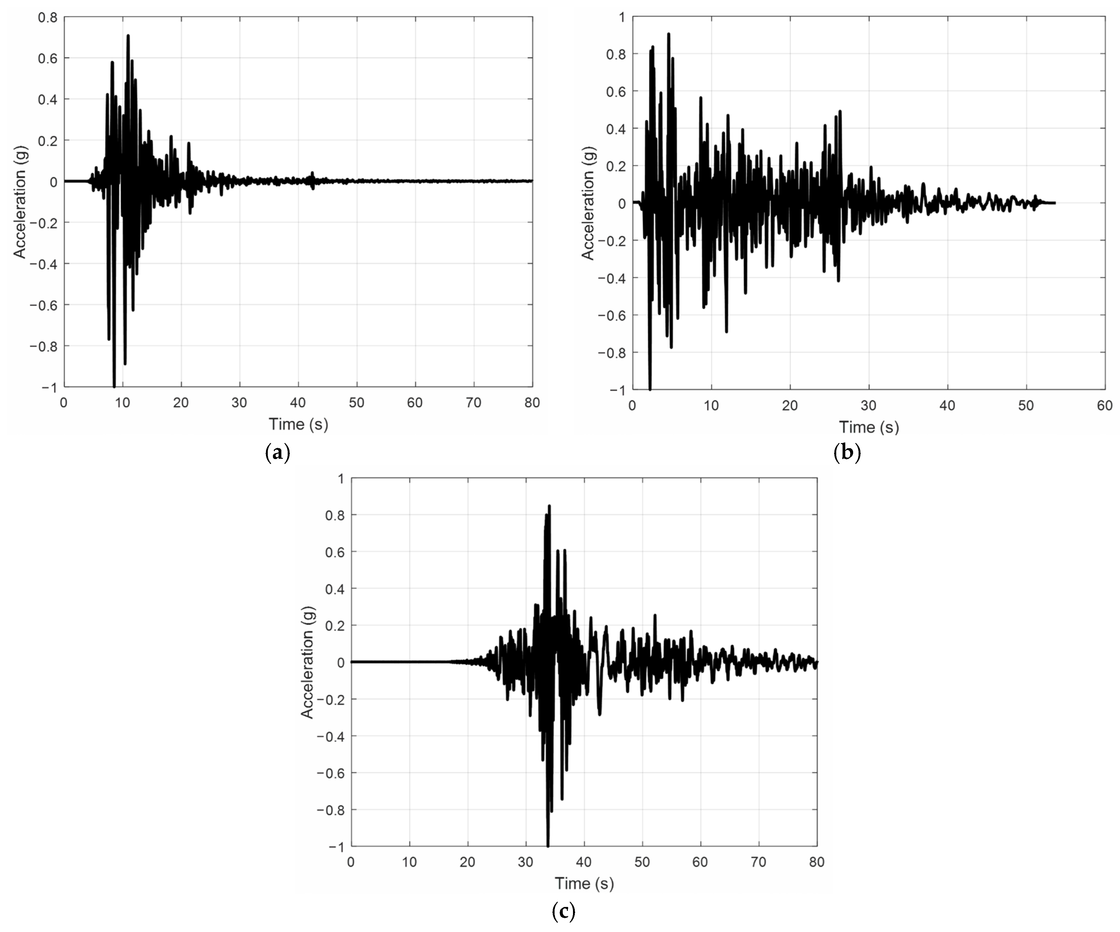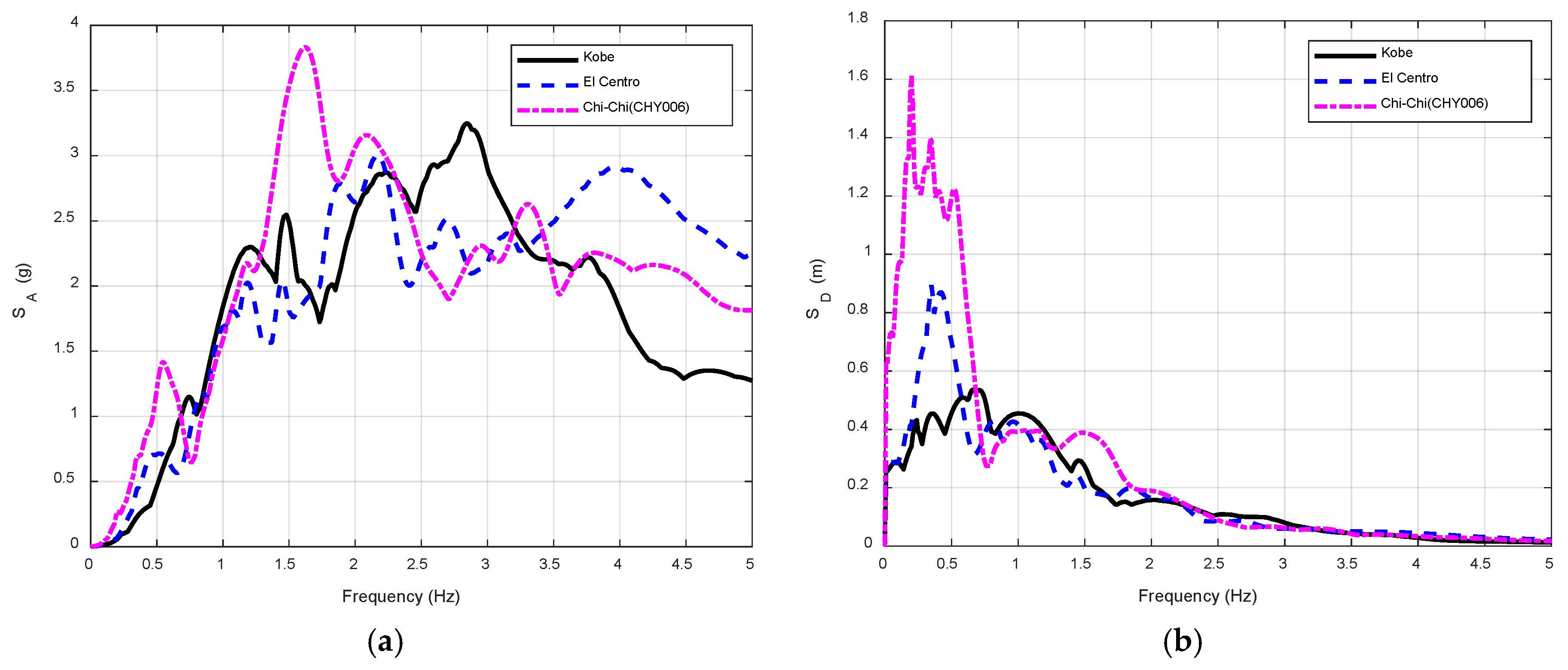 Three components of recorded ground motions were considered for reference: the EW component of the 1995 Hyogo-ken Nanbu (Kobe) earthquake recorded at the JMA station, the EW component of the 1940 Imperial Valley earthquake recorded at Array #6, and the EW component of the 1999 Chi-Chi earthquake recorded at the CHY006 station. Of these, the Chi-Chi CHY006 record was selected as the primary input motion for the nonlinear dynamic analyses, while the Kobe and Imperial Valley records were retained for comparative purposes to highlight differences in spectral shape and frequency content.