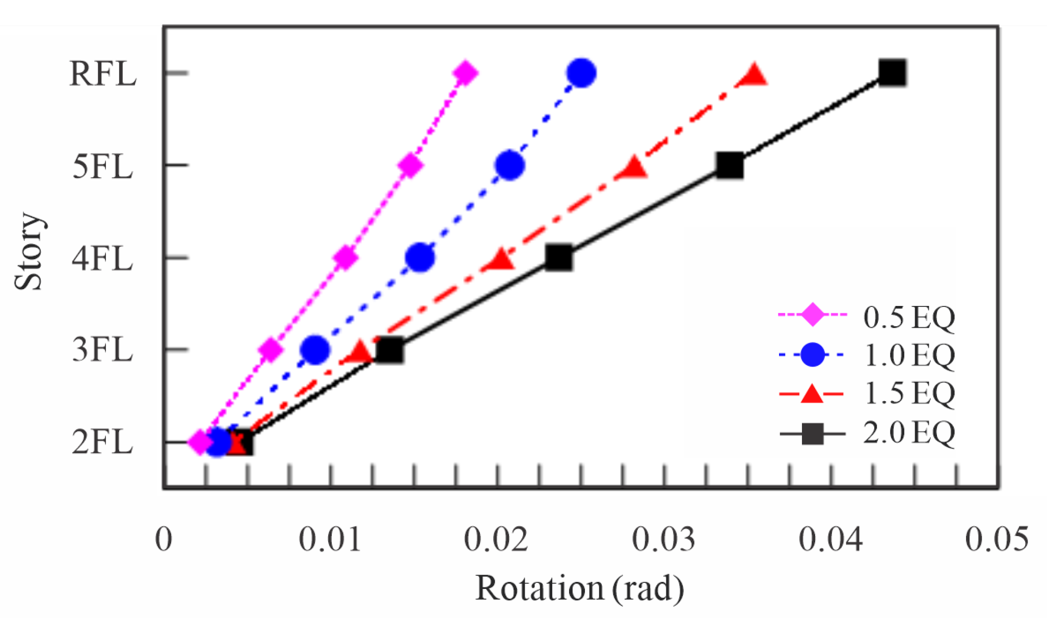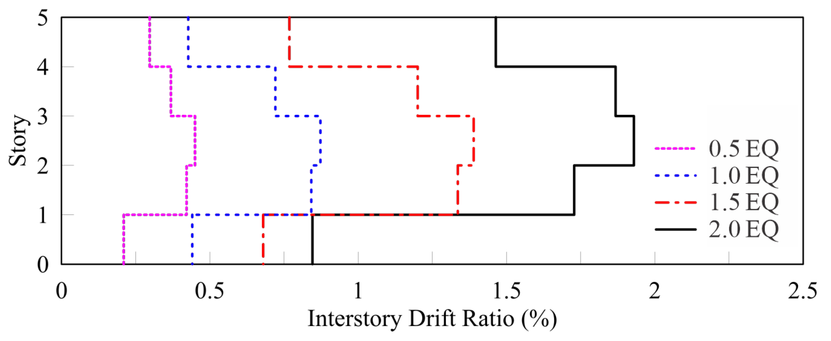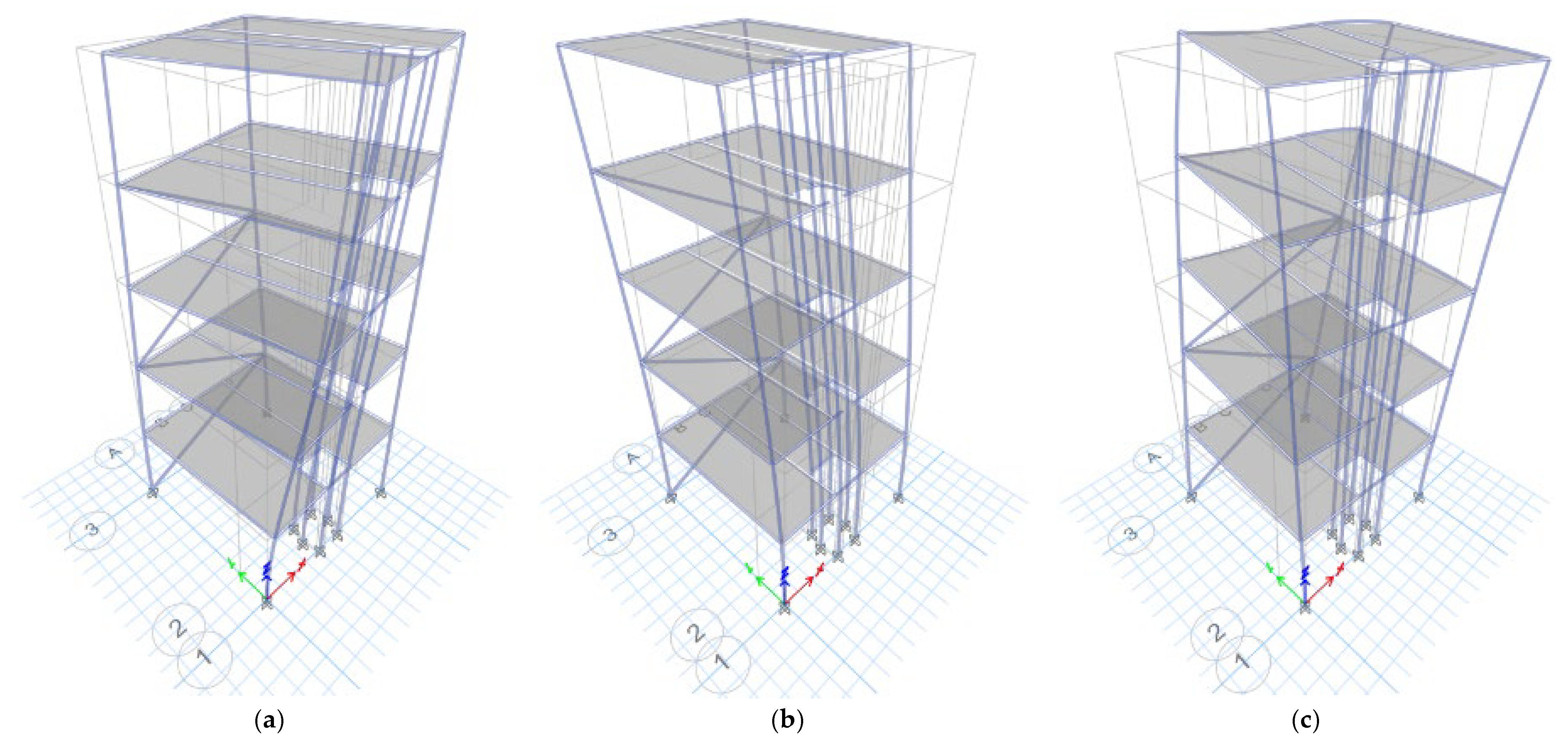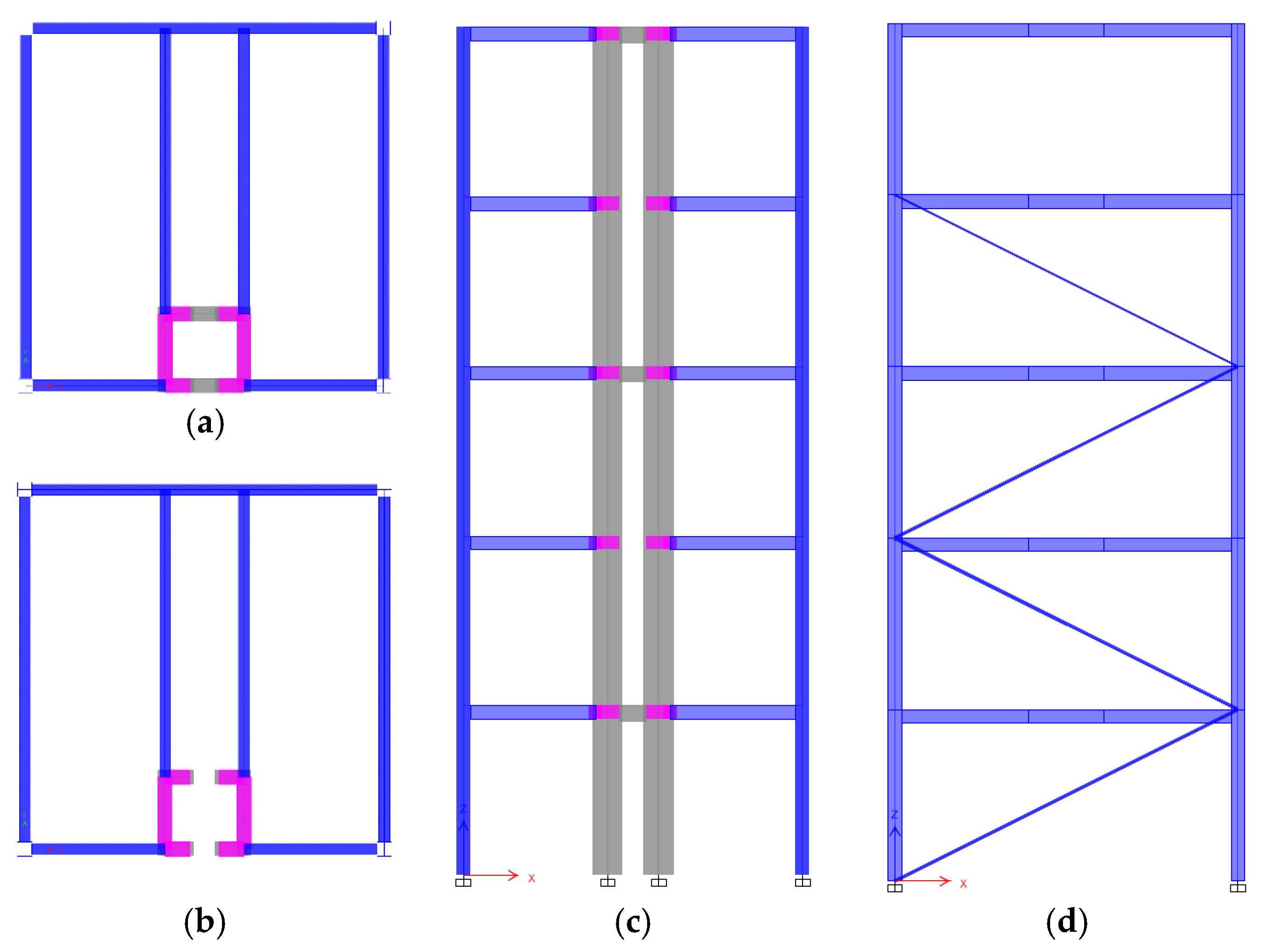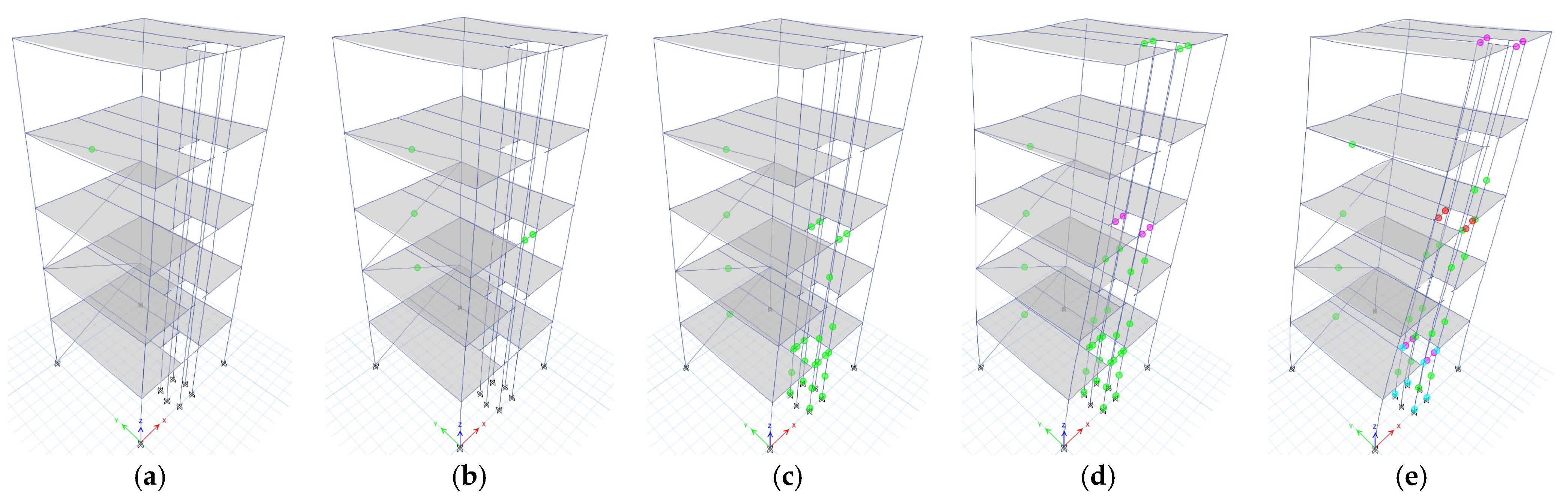 Table 6, the RC walls were idealized using an equivalent wide-column representation, which may lead to localized underestimation or overestimation of stiffness and deformation demands, especially near regions of stress concentration. The use of a reduced number of nonlinear hinges, concentrated at predefined critical locations, limits the ability of the model to fully represent the spread of plasticity along members under severe seismic excitation. Panel zones and beam–column joints were modeled using simplified rotational springs, and the floor slabs were assumed to behave as rigid or very stiff diaphragms; these assumptions may influence the predicted torsional response and the distribution of interstory drift, particularly in configurations with asymmetric stiffness. Consequently, the sensitivity of drift demand and torsional behavior to joint stiffness and diaphragm flexibility is not explicitly resolved in the present numerical framework. These limitations highlight the need for complementary experimental investigation to validate the modeling assumptions and to capture local deformation mechanisms that are not fully represented in the analytical model.