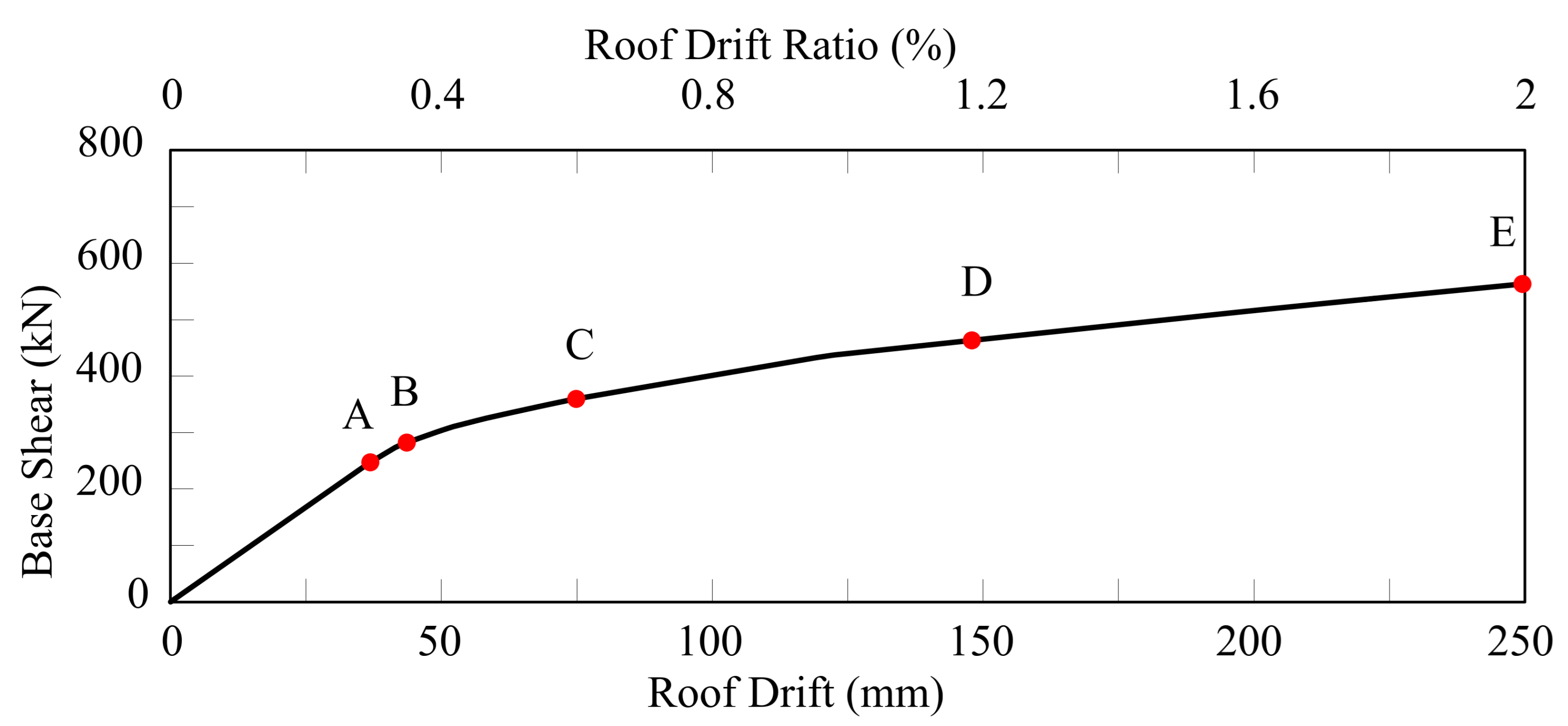 Figure 10a,b. The flexural and shear hinges of the RC wall were defined using TEASPA 4.0, which incorporates key backbone parameters such as cracking and yield strengths, post-yield stiffness ratio, and strength degradation, as shown in