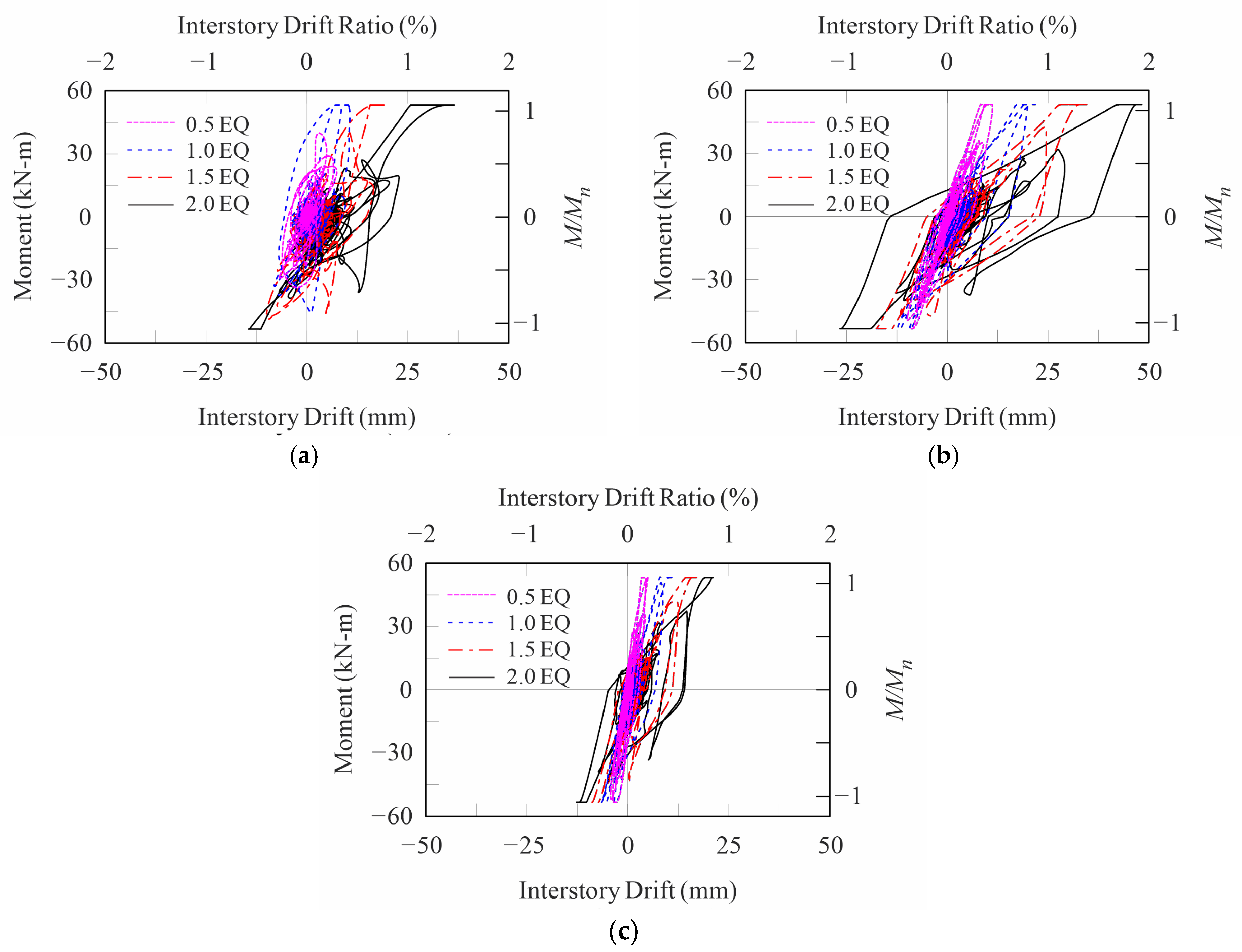 Figure 10e,f. To capture cyclic degradation and energy dissipation behavior, the Takeda hysteresis model was applied to RC members, whereas the kinematic hardening model was used for steel members. In summary, flexural hinges were assigned at the ends of members to represent plastic rotations, while shear or axial hinges were introduced at critical locations corresponding to the expected inelastic mechanisms.