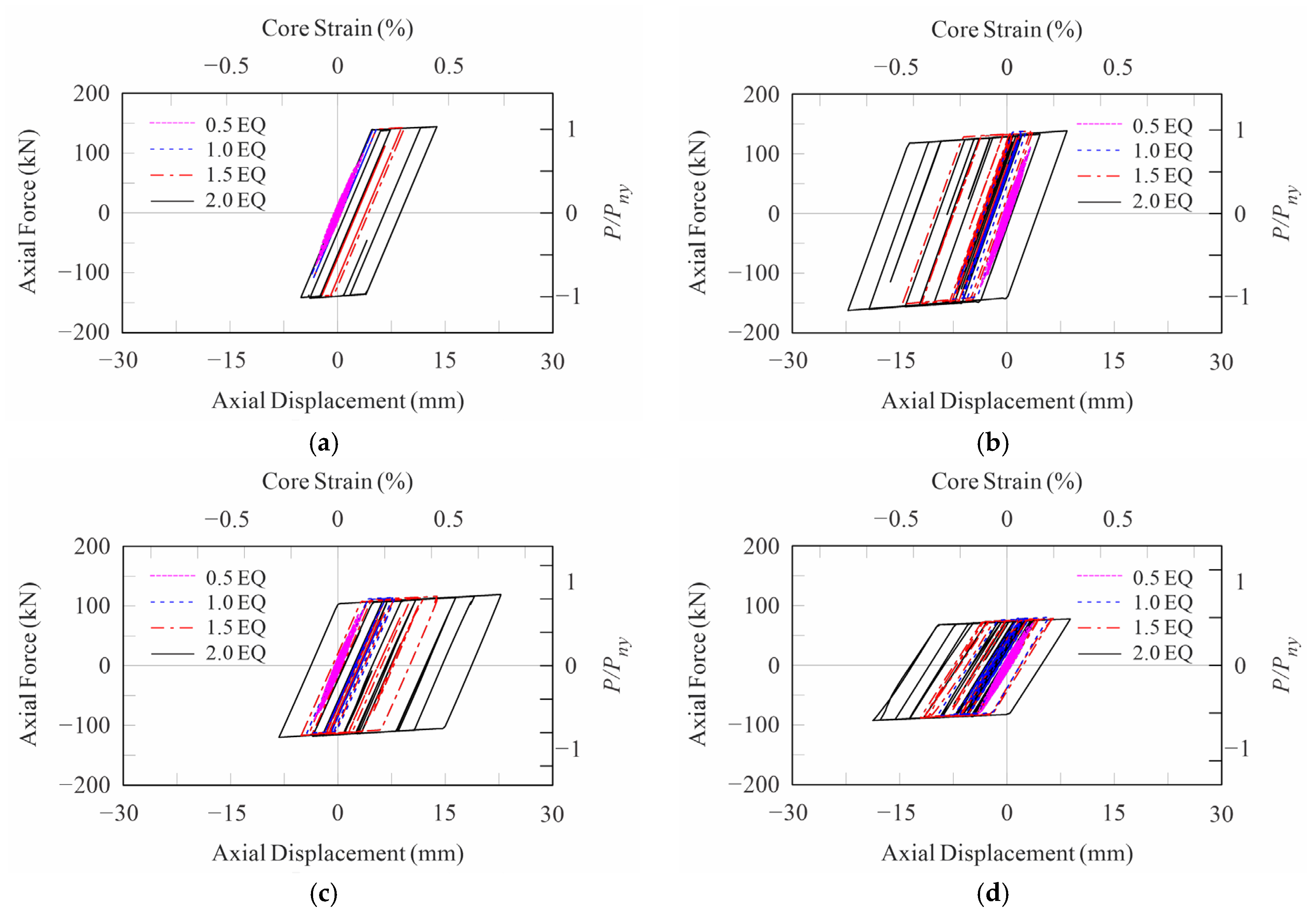 To achieve the desired deformation performance, additional refinement was applied to the core plate and restraining components. The dimensions of the stiffener and the slit spacing on the face plates were adjusted to ensure that the core could undergo axial deformation without premature buckling. This tuning process enabled the braces to reach the target strain capacity while maintaining stable hysteretic behavior under cyclic loading. In this study, all four SBRBs were designed to sustain axial core strains exceeding 4.5%, in order to confirm their ability to provide reliable energy dissipation and consistent mechanical performance under simulated seismic demand. In this design approach, the SBRBs were expected to exhibit stable load–deformation characteristics and to contribute significantly to the overall seismic resilience of the hybrid structural system. Once these requirements had been met, the SBRB design was finalized, and the corresponding geometric and mechanical properties are summarized in