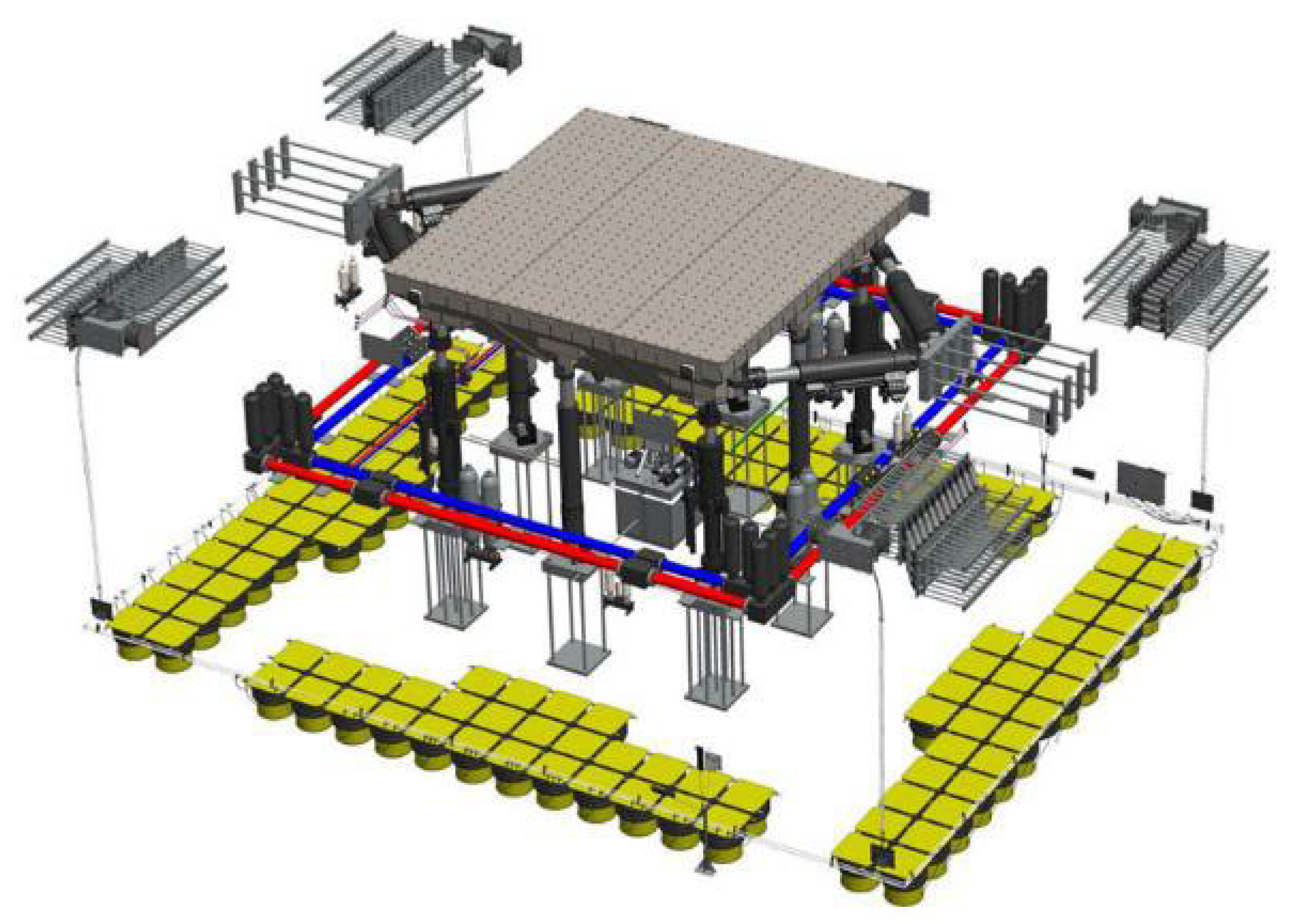 Figure 23. This advanced facility features an 8 × 8 m shaking table with a 250-ton payload capacity, and is capable of generating three-dimensional broadband ground motions with high accuracy and control. The system can achieve horizontal and vertical strokes of ±1.0 and ±0.4 m, maximum velocities of 2 and 1 m/s, and peak accelerations of up to ±2.5 g horizontally and ±3.0 g vertically. These capabilities enable the realistic reproduction of design-level seismic demand, including both high-frequency acceleration pulses and long-period displacement components, thus ensuring that the structure experiences loading conditions consistent with those assumed in the numerical analyses.
