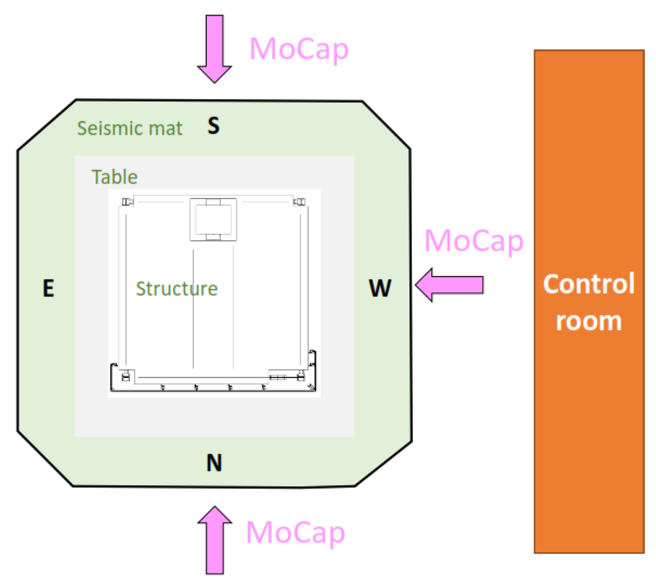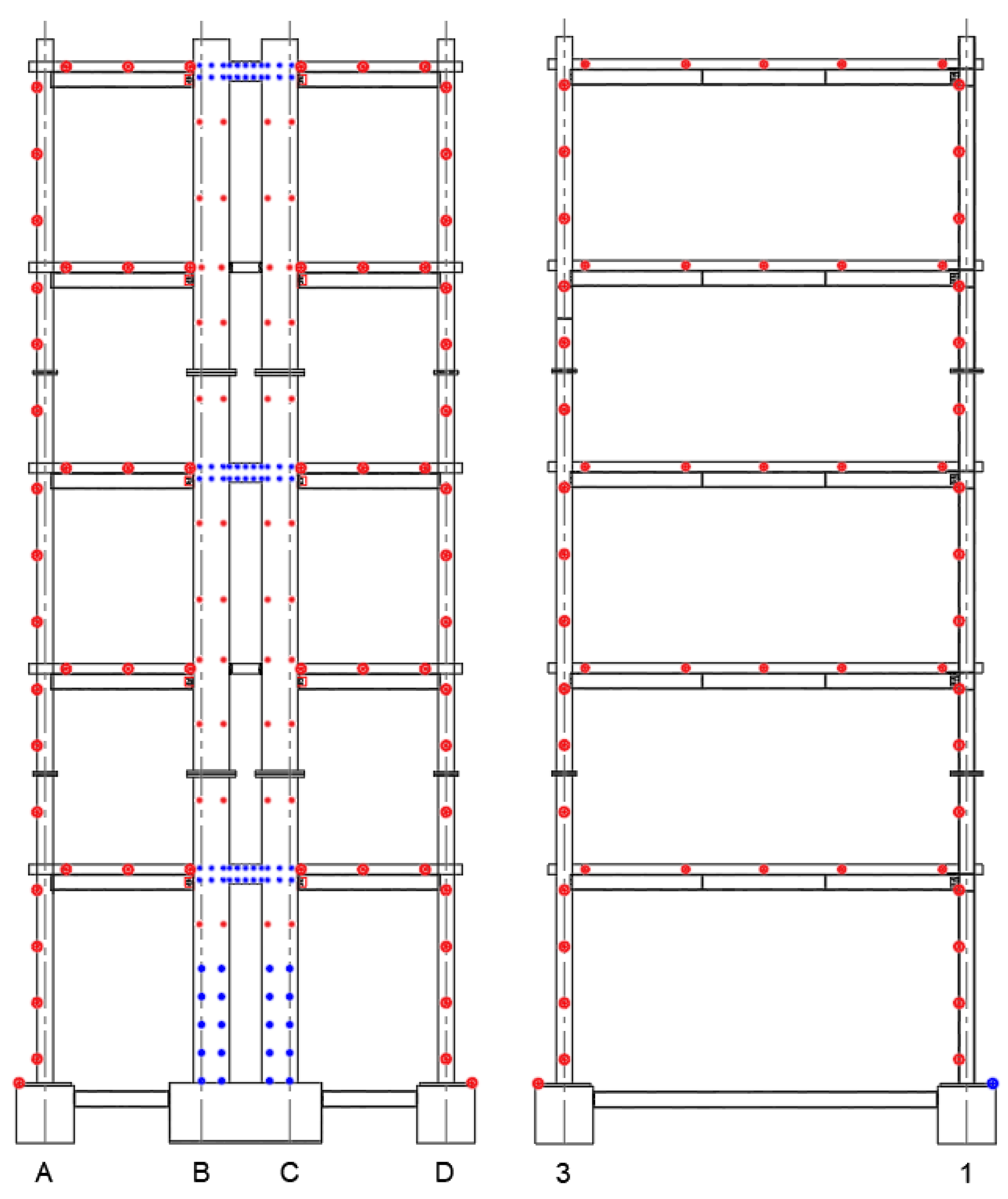 Figure 25, will be installed at each floor to capture both translational and rotational accelerations during shaking. These sensors will provide essential data for evaluations of the floor accelerations, interstory drift ratios, and dynamic amplification effects, which together describe the global seismic behavior of the hybrid structural system. In addition to the conventional accelerometers, a motion capture (MoCap) system will be incorporated to record the three-dimensional displacement field and torsional rotations with high precision. This enhanced instrumentation strategy will also enable direct measurement of critical local deformation parameters that were not explicitly resolved in the numerical analysis, including wall base curvature or rotation and coupling beam chord rotation, which are essential for detailed component-level performance assessment. This system will allow for continuous tracking of the absolute motion at critical points across the structure, offering an accurate visualization of its dynamic deformation patterns and enabling detailed comparison with analytical predictions.