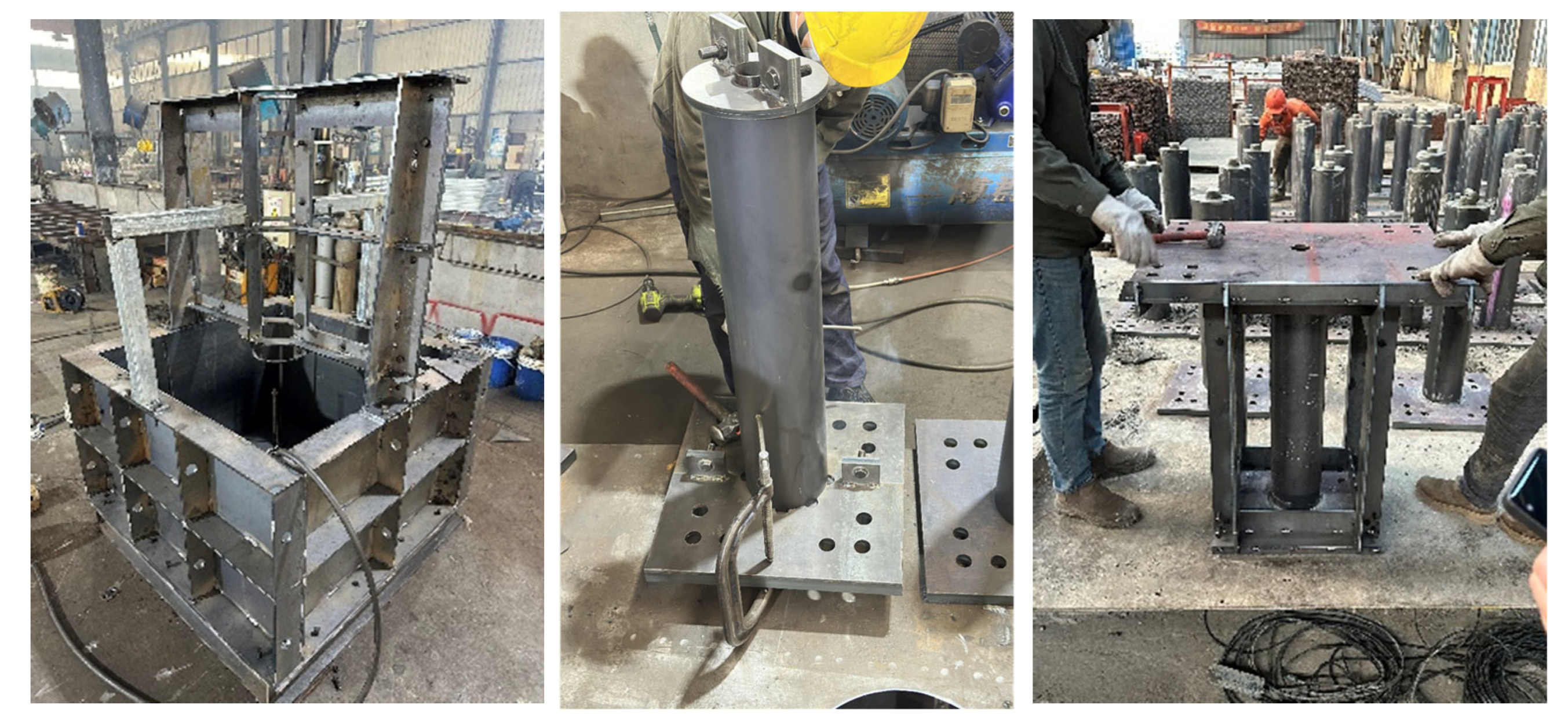 - Jin, K.-Y.; Wang, Y.-H.; Zhou, X.-H.; Deng, R.; Hu, C.; Wen, H. Behavior of super-sized thin-walled CFDST columns for wind turbine towers subjected to combined loads: Experiment. Eng. Struct. 2024, 303, 117458. [Google Scholar] [CrossRef]