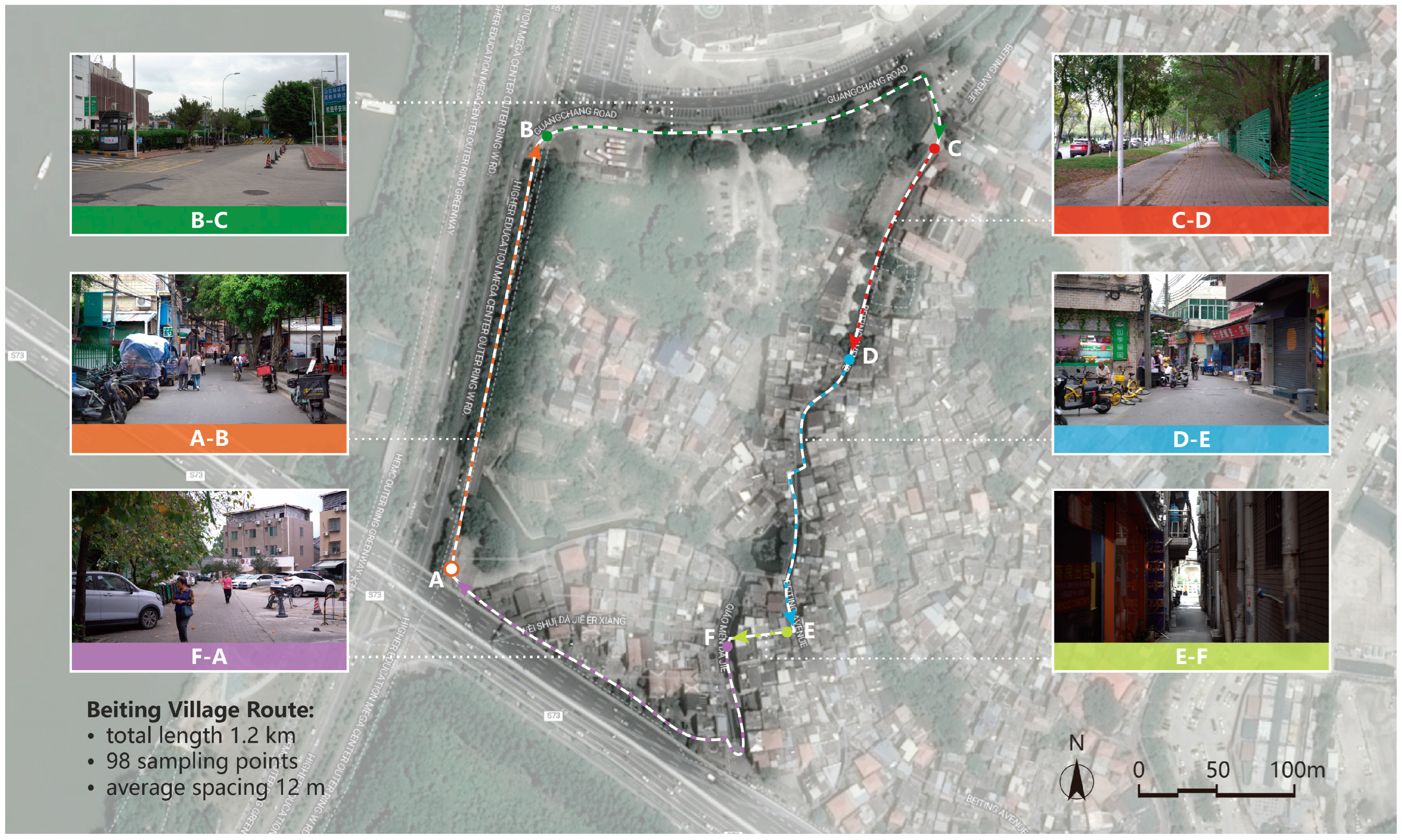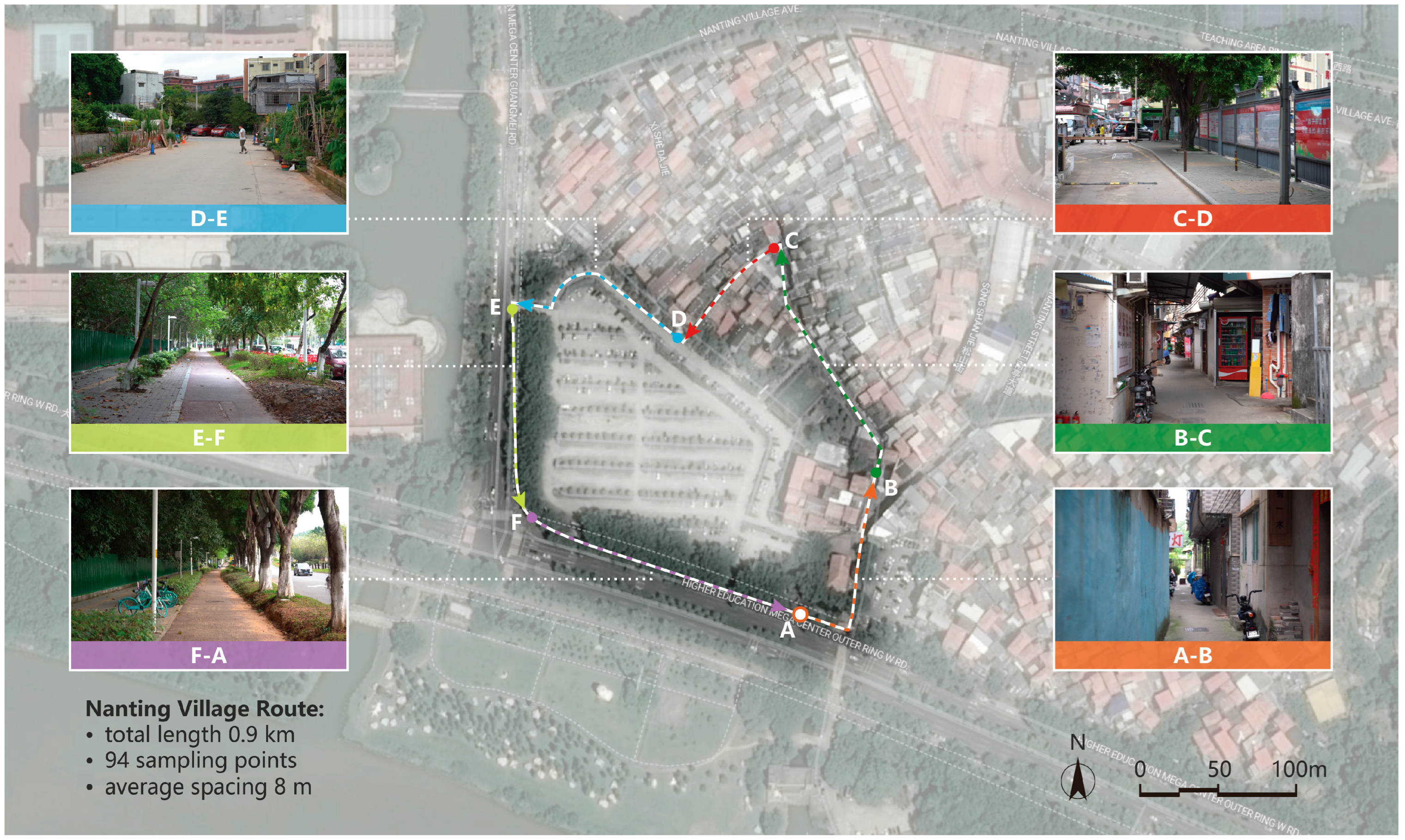 Xiaoguwei Island, situated in the northern part of Panyu District, Guangzhou, encompasses four typical urban villages. This study focuses on two representative urban villages on the island, characterized by the largest populations of elderly residents, as well as complex spatial environments. The first site, Beiting Village, boasts the only large-scale commercial center on the island. Furthermore, its attractive environment, convenient transportation, and numerous public squares draw many elderly residents who engage in relaxation, exercise, and walking. The second site, Nanting Village, offers a unique artistic atmosphere while featuring a narrower pedestrian pathway system compared to Beiting Village. The initial segment of the Beiting Village route features beautiful natural landscapes, while the latter segment transitions into a high-density urban village environment characterized by gradually increasing housing densities. Conversely, the first segment of the Nanting Village route presents an urban village living environment. The second segment reveals a natural environment that offers a gradually wider view and more beautiful surroundings. The walking route to Beiting Village is 1.2 km, and that to Nanting Village is 0.9 km.