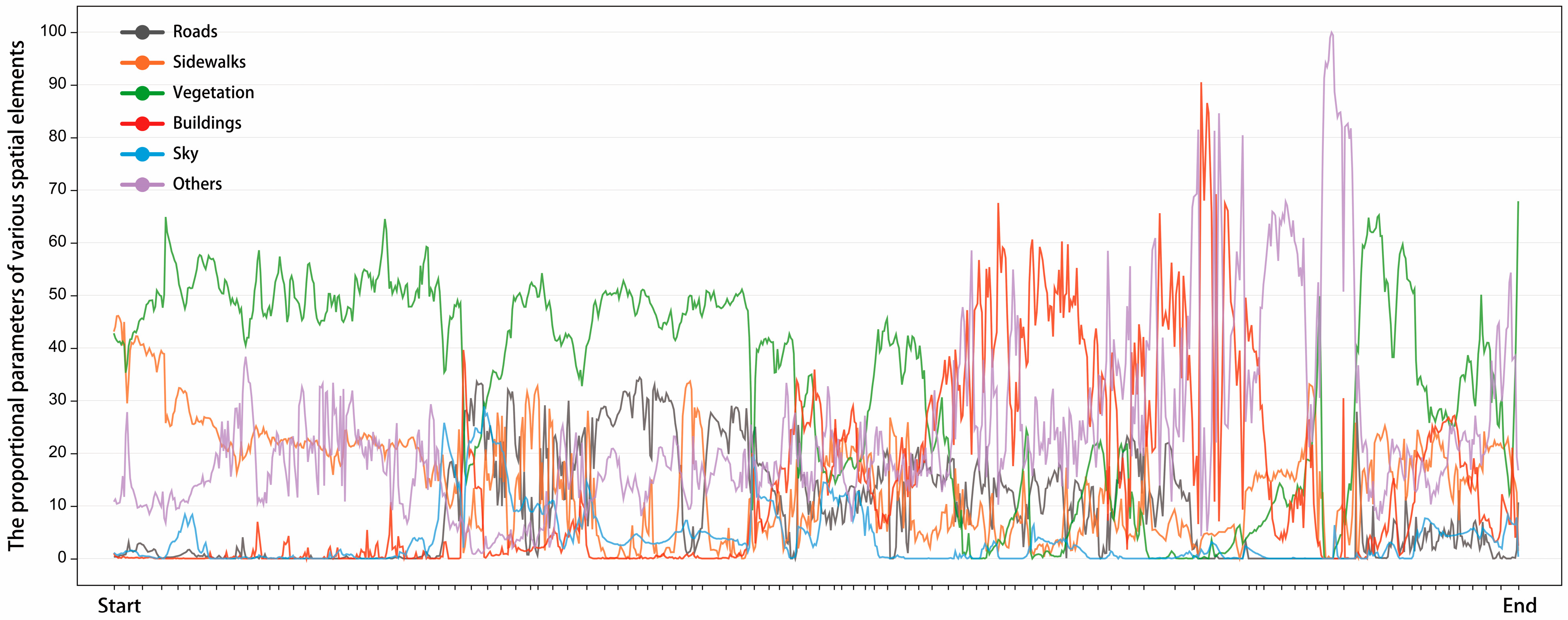 To establish a one-to-one correspondence between environmental visual exposure and physiological responses, three time series were synchronized: the time when a participant passed each predefined sampling point along the route, the time stamps associated with the semantic-segmentation outputs for the route video, and the EDA recording time series.