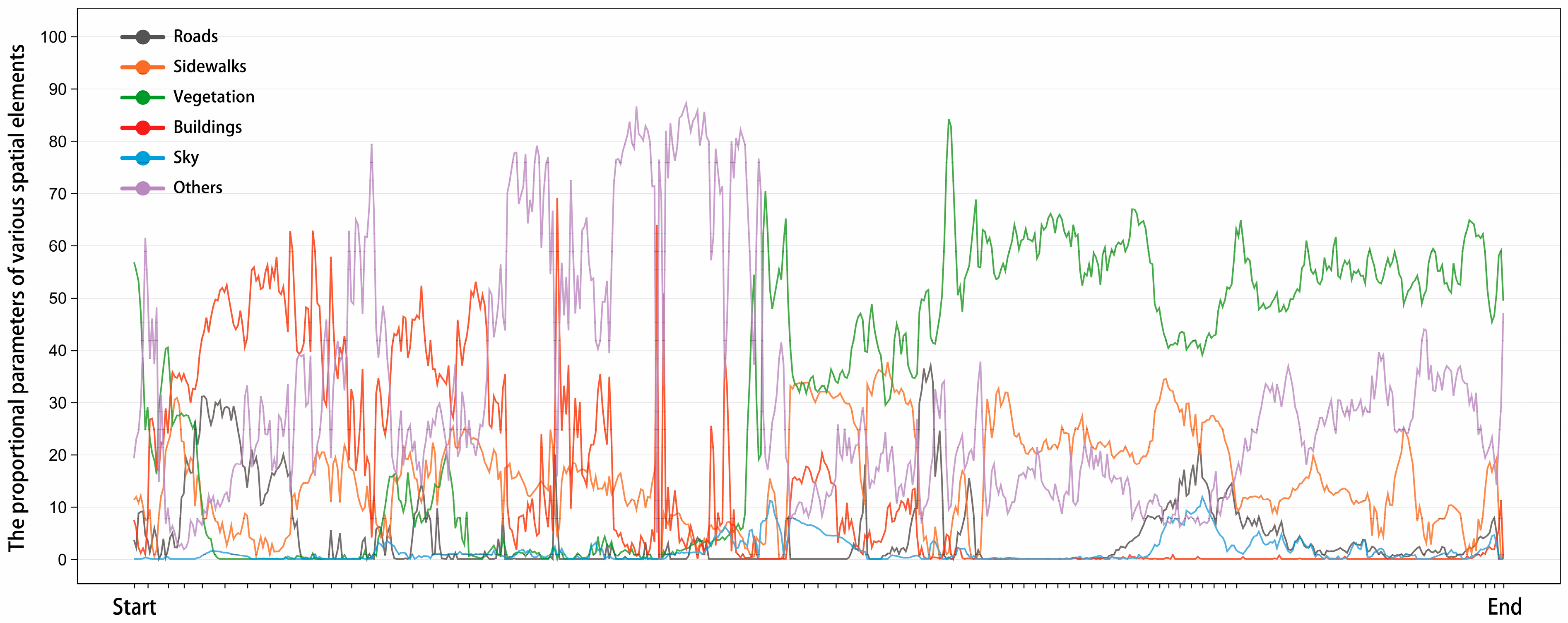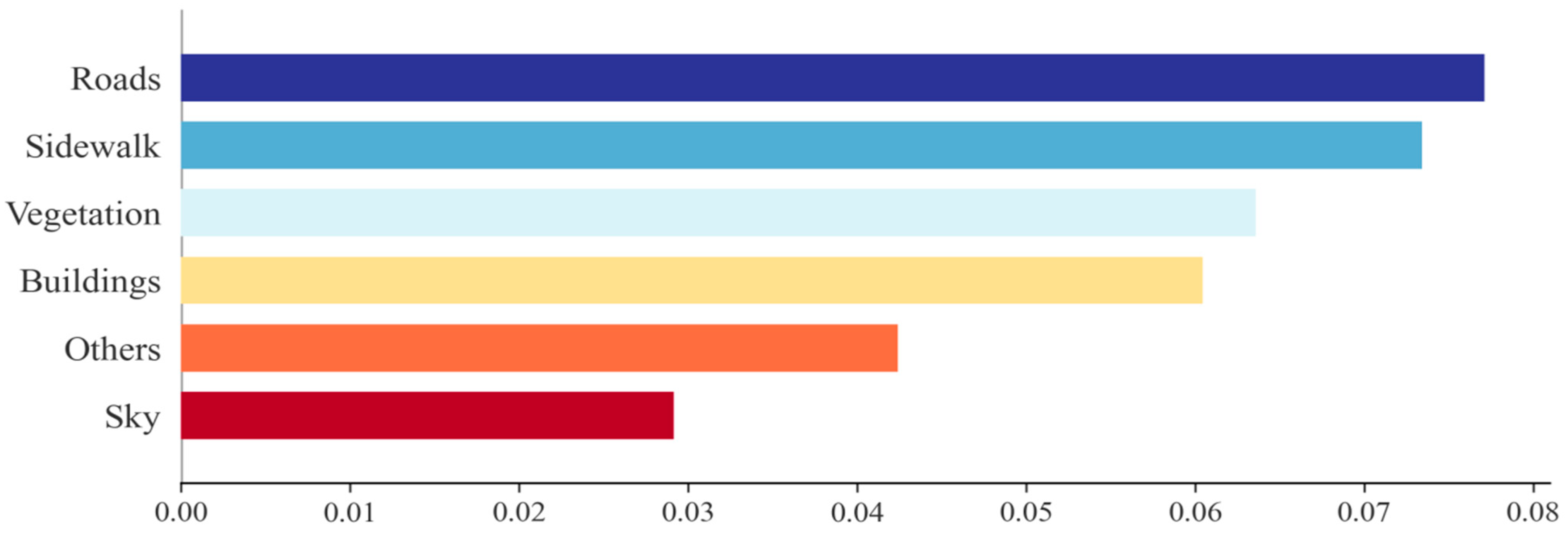 The segmentation output contains 133 semantic classes. To meet the analytical needs of the walking experiment and improve interpretability, we merged these classes into six broad streetscape categories: Roads, Sidewalks, Vegetation, Buildings, Sky, and Others. For each frame, the visual exposure of each category was computed as the proportion of pixels assigned to that category. Using aggregated proportions over six broad categories can reduce sensitivity to fine-grained misclassifications.