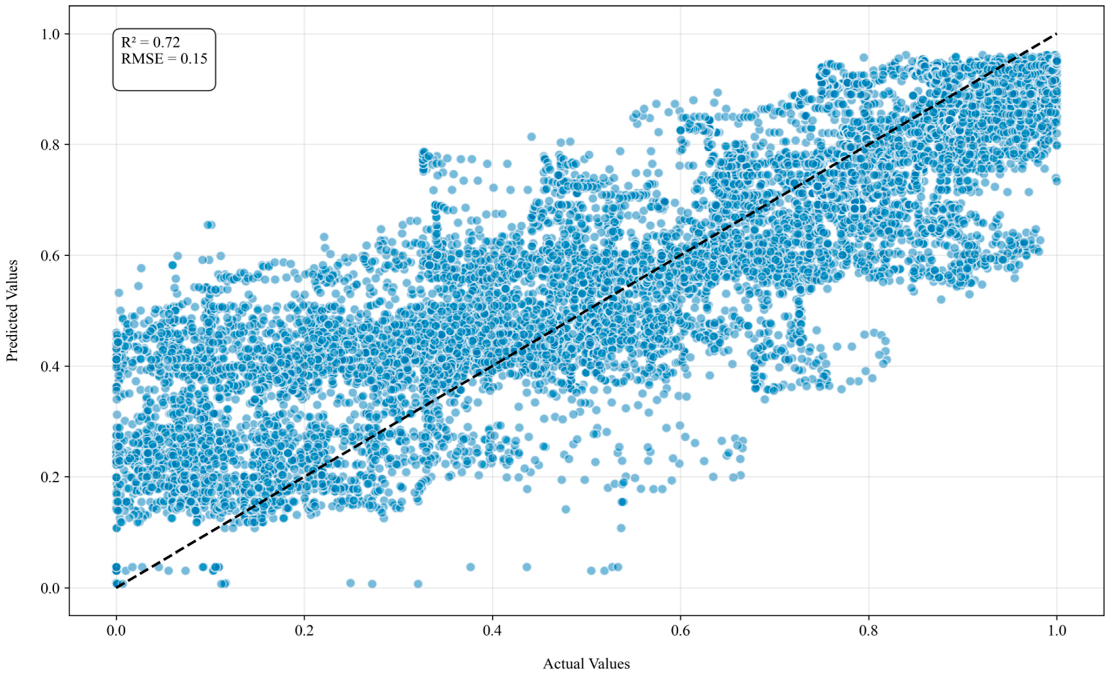 In this study, CatBoost gradient boosting was employed to model the relationship between streetscape visual exposure and physiological stress. Each aligned observation consisted of six visual-exposure proportions (Roads, Sidewalks, Vegetation, Buildings, Sky, and Others) as input features, and the corresponding normalized SCL value as the regression target. The CatBoost model was trained on the constructed dataset to generate stress predictions, and model performance was evaluated using standard regression metrics.