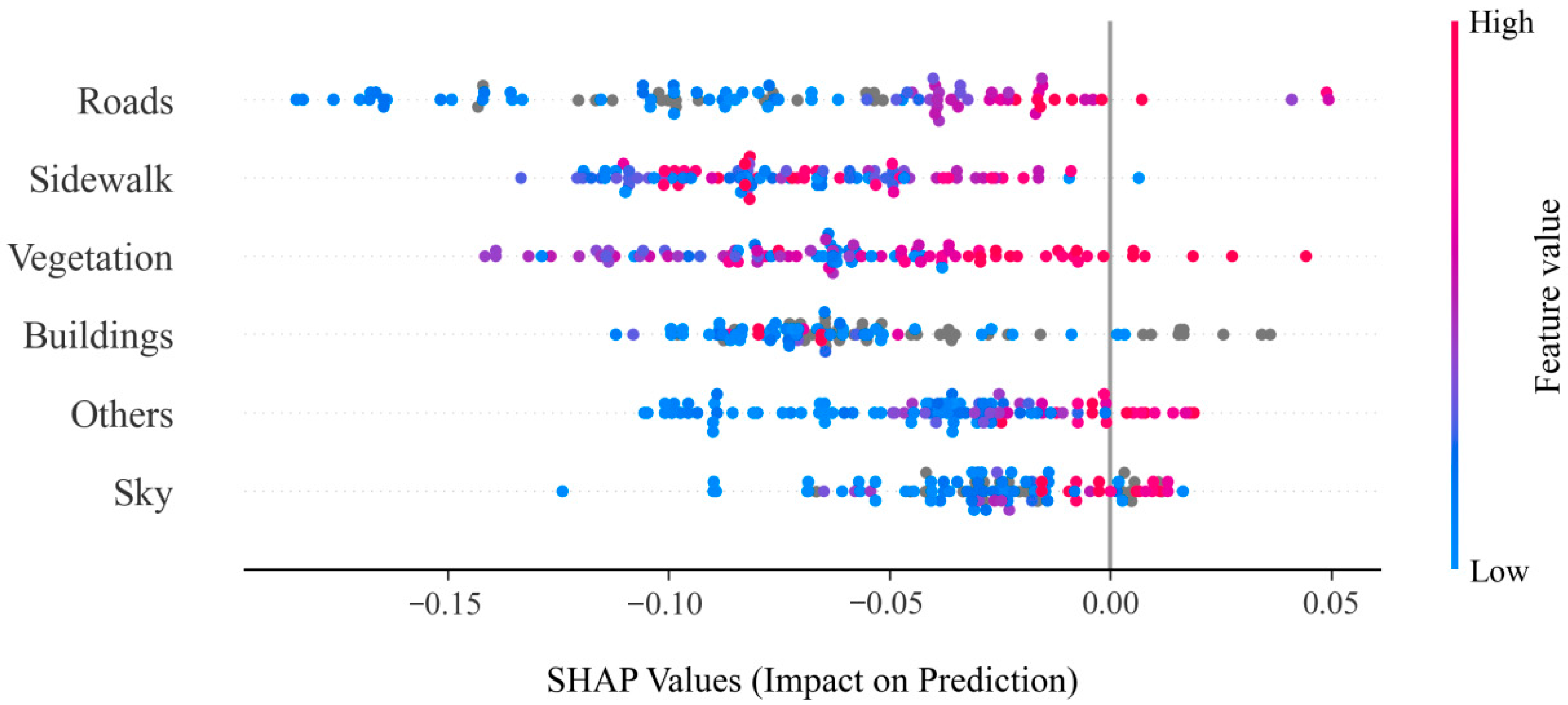 Finally, this research has several limitations that suggest avenues for future research. First, a limitation is potential segmentation misclassification in dense and visually complex urban-village streets. Although we used a well-established pretrained model and aggregated 133 classes into six broad categories using proportion-based features (which smooths random pixel-level errors), systematic confusions (e.g., road vs. sidewalk under occlusions) may propagate into the predictors and influence the magnitude of estimated effects and SHAP explanations. Future studies could improve robustness by fine-tuning the segmentation model on domain-specific imagery and introducing uncertainty-aware feature extraction. In addition, the semantic segmentation technology utilized here categorized the environment into broad classifications such as “vegetation” and “buildings,” overlooking nuanced differences within these groups, such as the transparency of building facades and the maintenance levels of greenery. Subsequent studies should leverage advanced computer vision techniques to uncover the specific principles underlying “beneficial buildings” and “high-quality vegetation”.