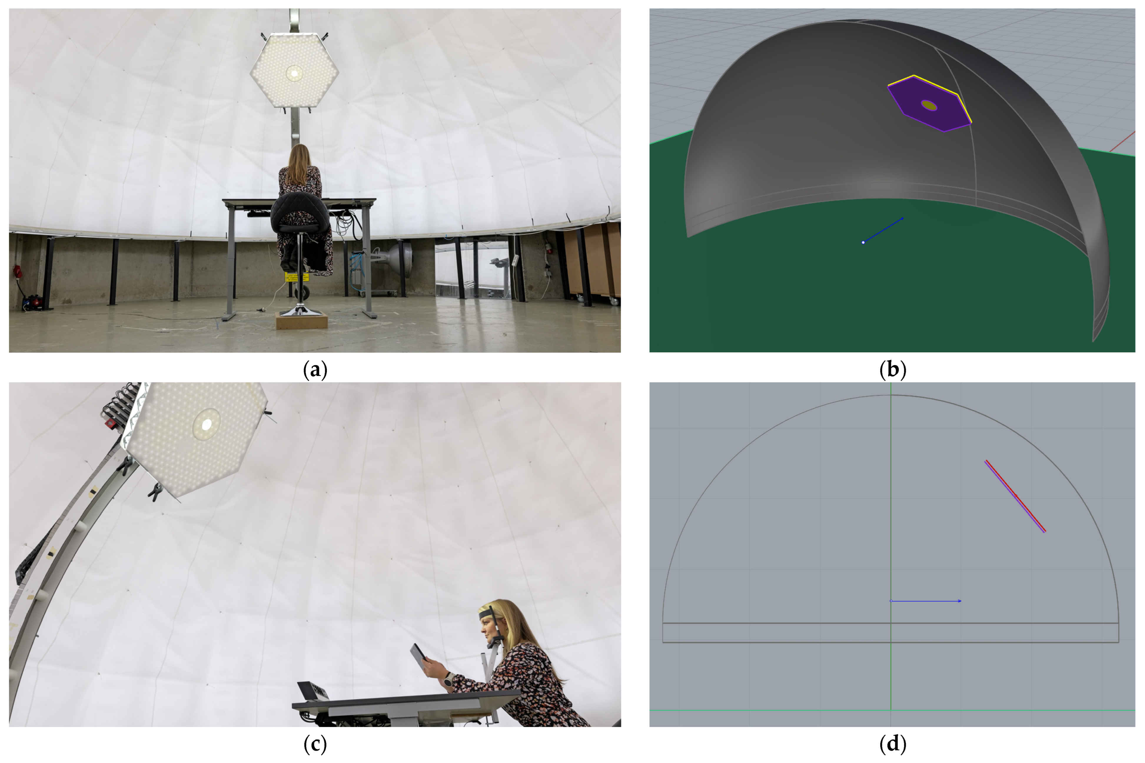 Person participating in study under the artificial sky: (a) view into the sky dome hemisphere with glare source at 0° azimuth, 40° elevation; (b) view of schematic design with artificial sun, viewpoint, and direction; (c) close-up with chin-headrest (tilted 10° from normal); (d) side view of schematic design.